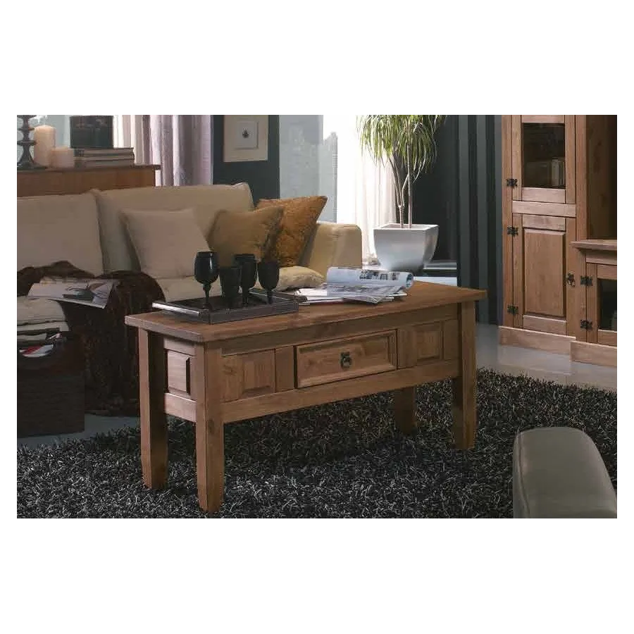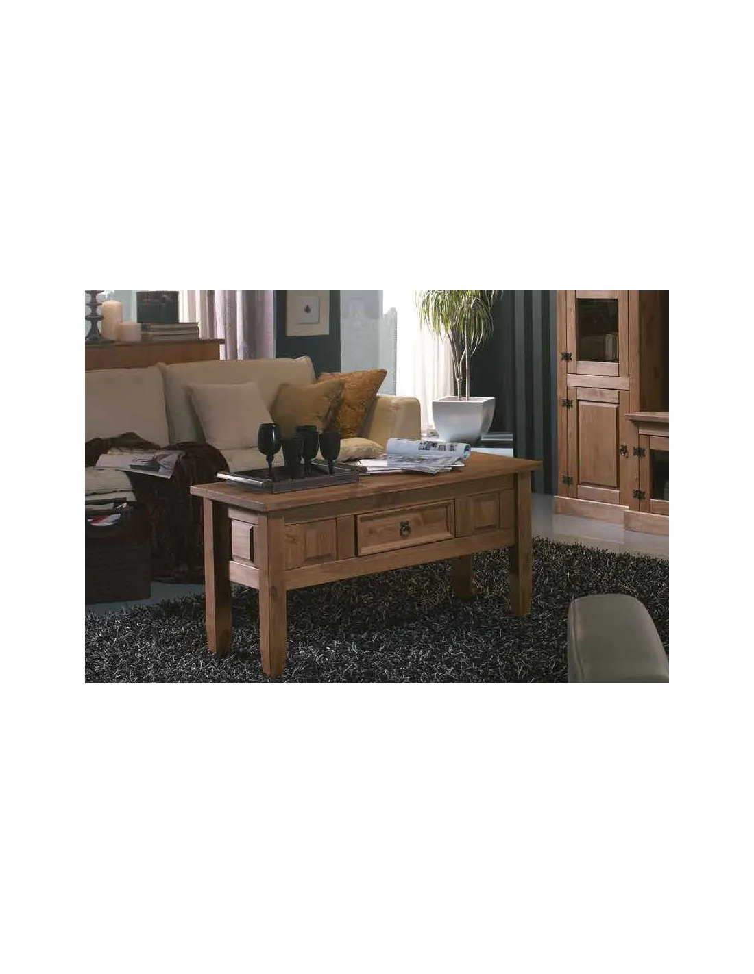 Mesa de centro de estilo rústico con un cajón de importación. Hecha en madera de pino macizo con acabado encerado.