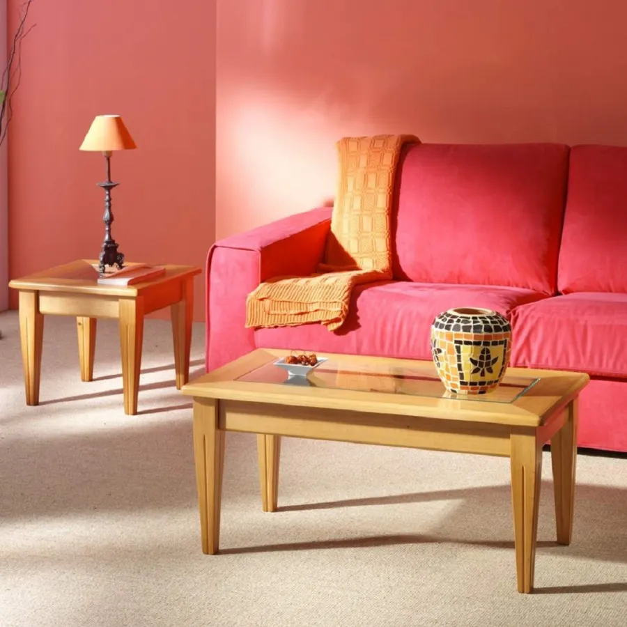 Mesa de centro en estilo clásico fabricada en madera maciza de pino y de fabricación española. Disponible en una amplia serie de colores con terminación barnizada y lacada, así como en varias medidas tanto de ancho como de largo.