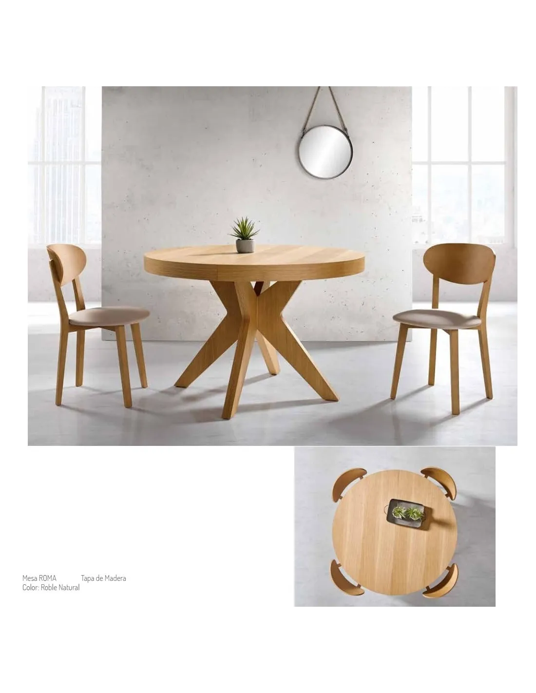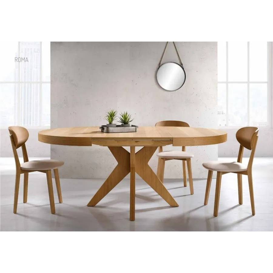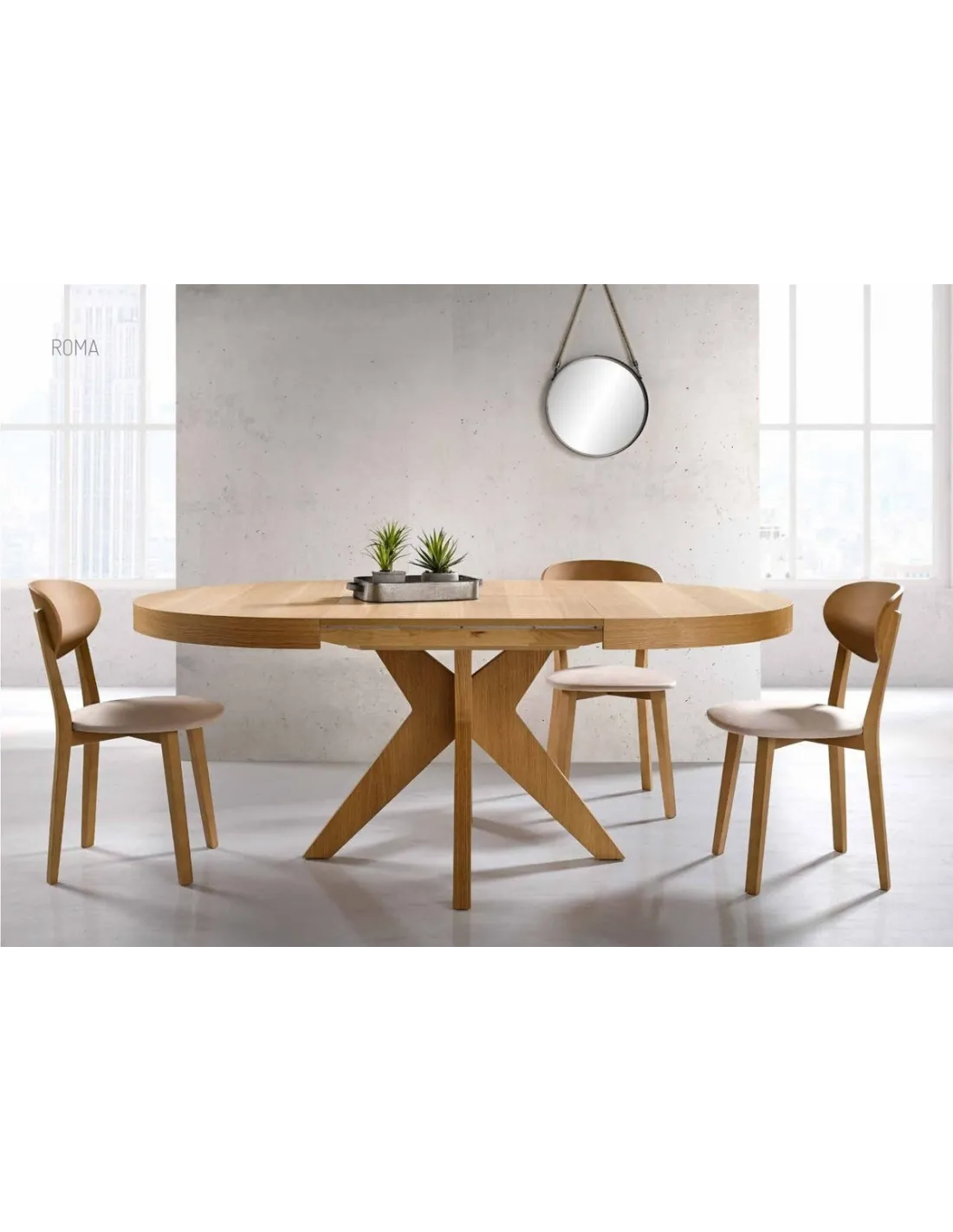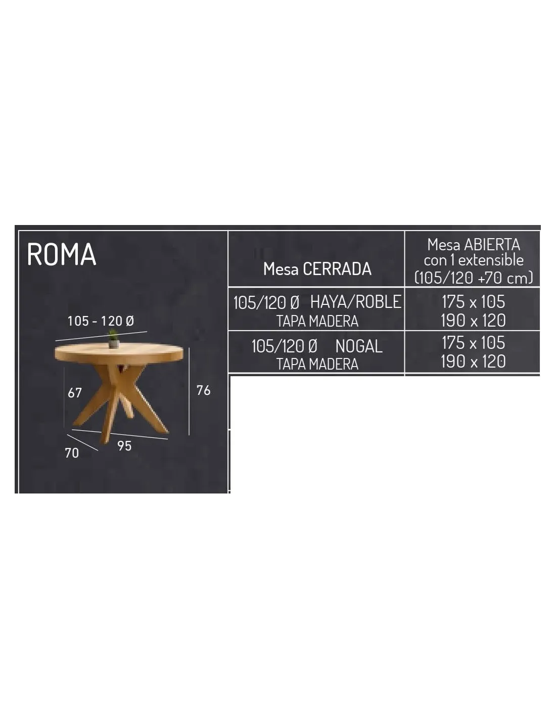 La mesa Roma viene disponibles en dos medidas de largo: 105 y 120 cm. con una altura de 76 cm., que se puede extender mediante mcanismo central 70 cm. adicionales, quedándose las mesas abiertas en 175 y 190 cm. respectivamente.