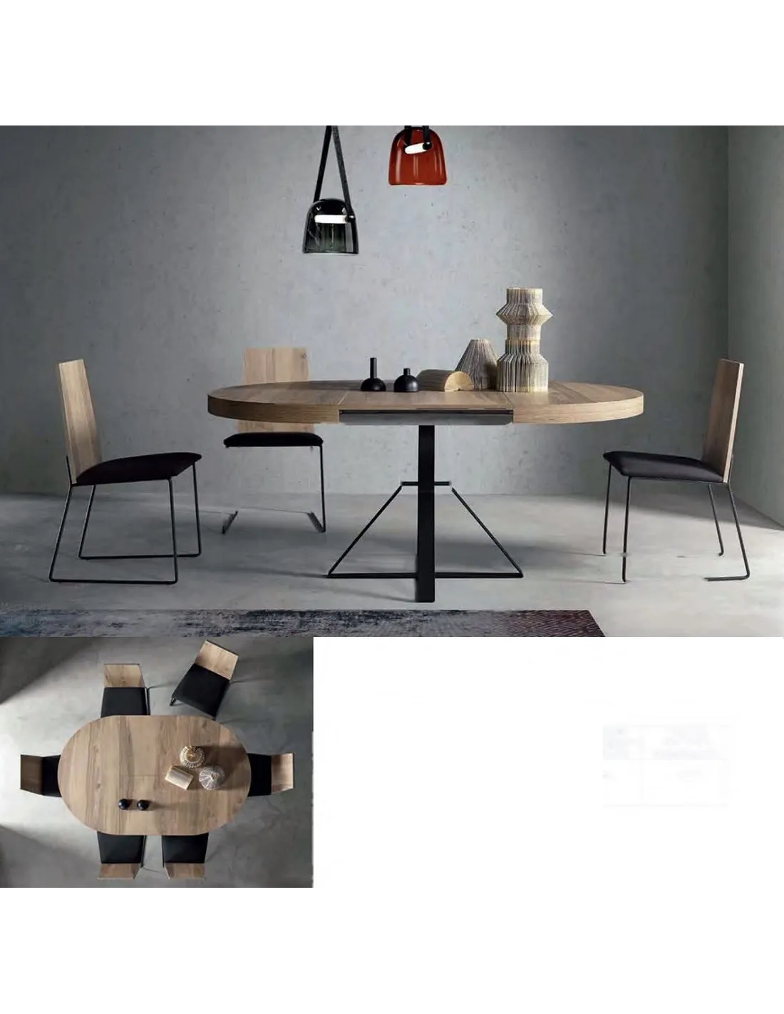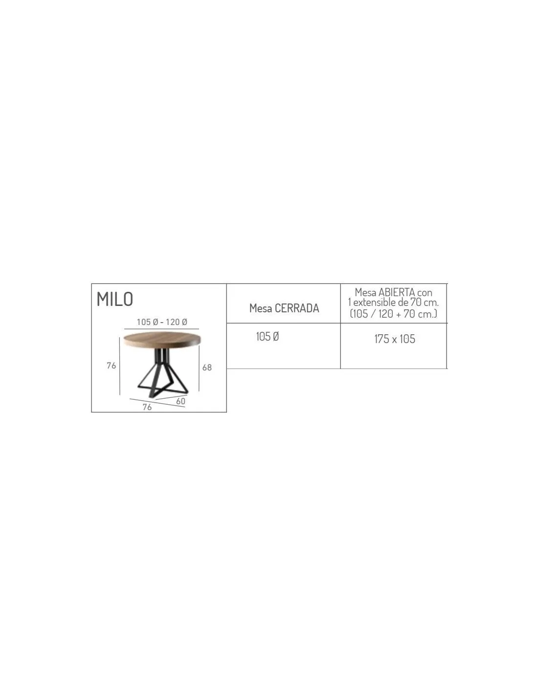 La mesa extensible Milo cuenta con medida cerrada de diámetro 105 cm., que con el mecanismo extensible suman 70 cm. quedándose mesas abiertas de 175 cm.
