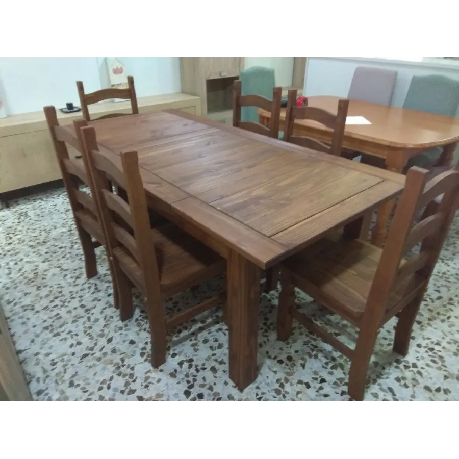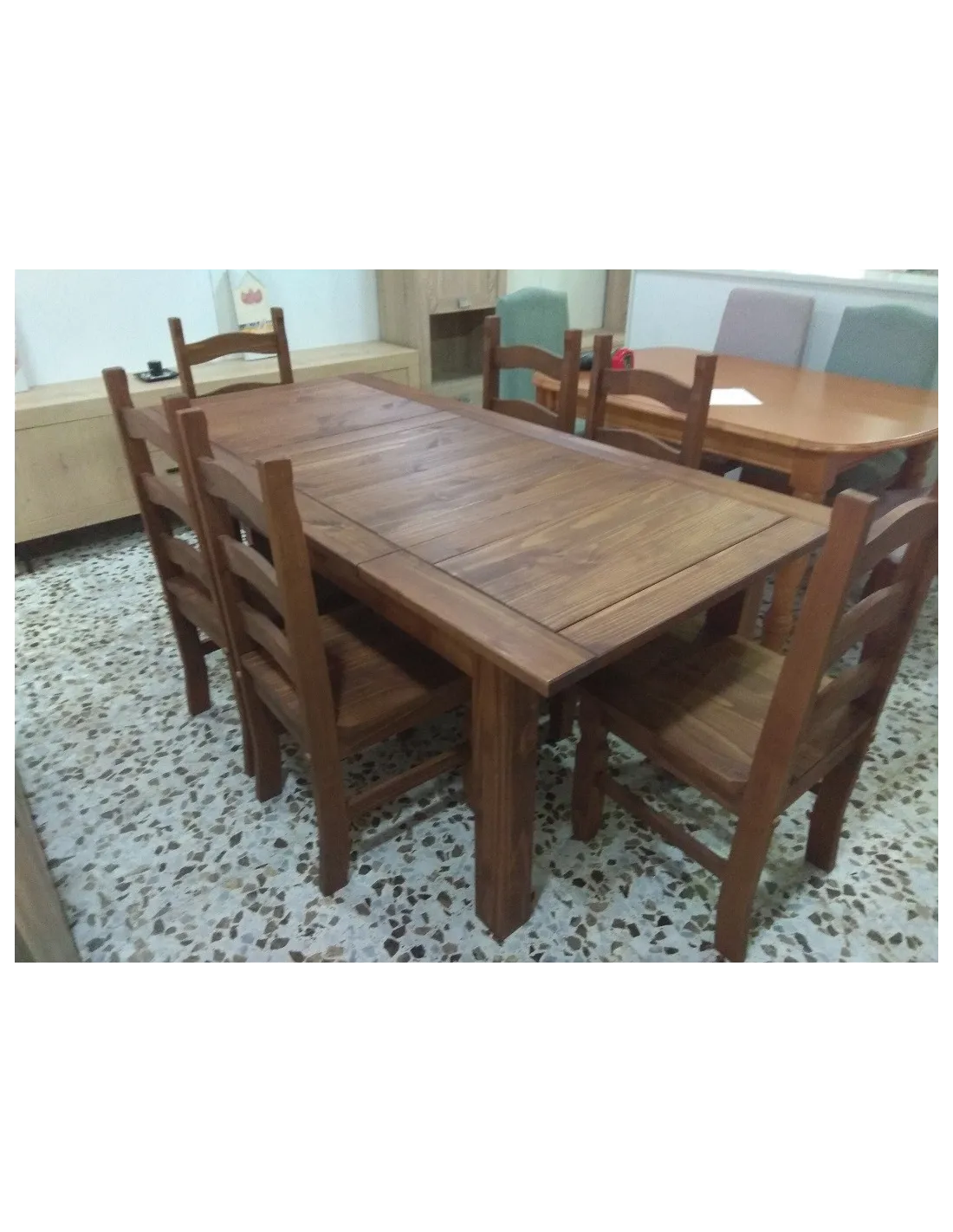 Conjunto de comedor extensible con 4 o 6 sillas de diseño colonial en madera maciza de pino color nogal oscuro encerado en formato kit