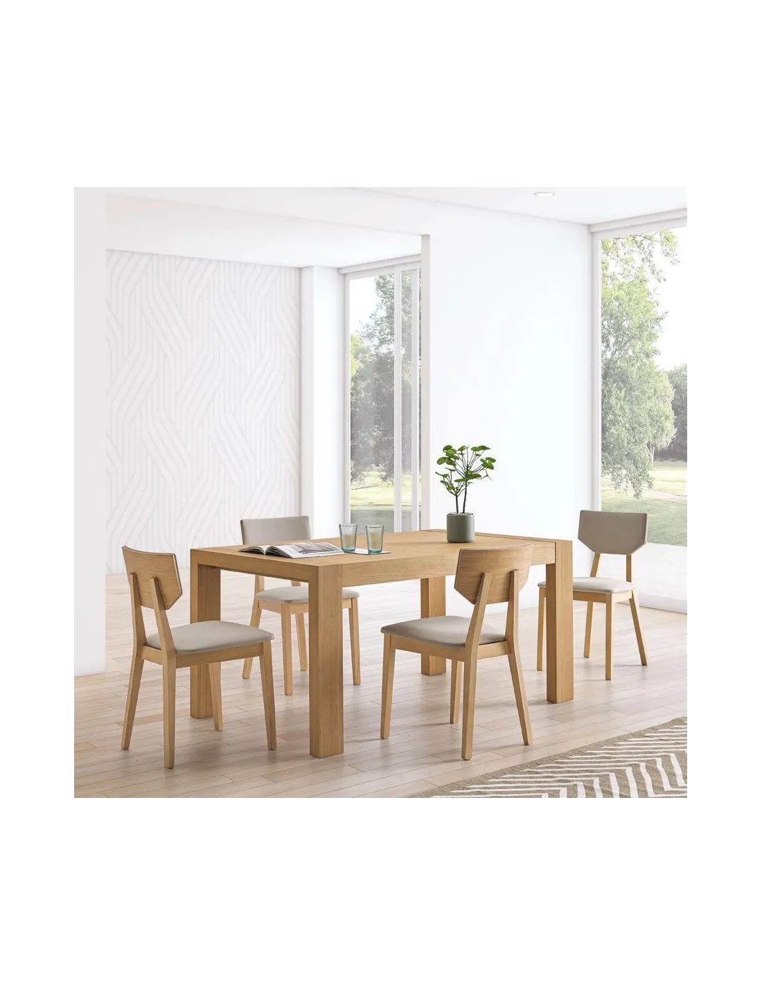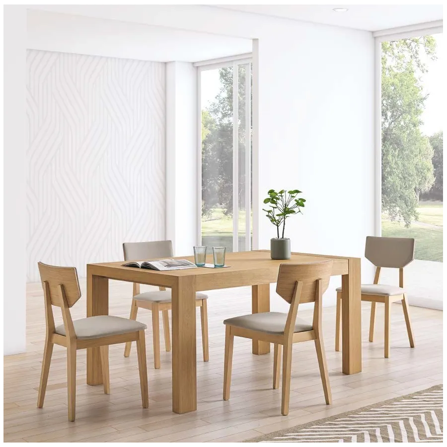 El pack de la mesa Évora Melamina extensible con sillas cuenta con varias medidas que aumentan 60 cm. gracias a su mecanismo extensible de carro, donde sus patas de 6x12 se deslizan sobre el suelo quedando situadas en los extremos de la mesa.