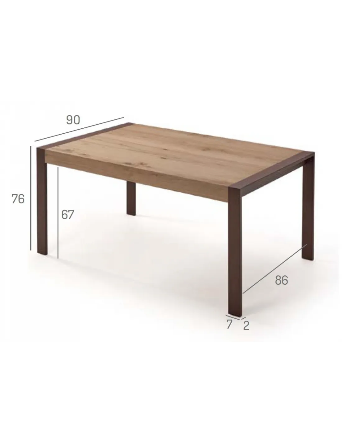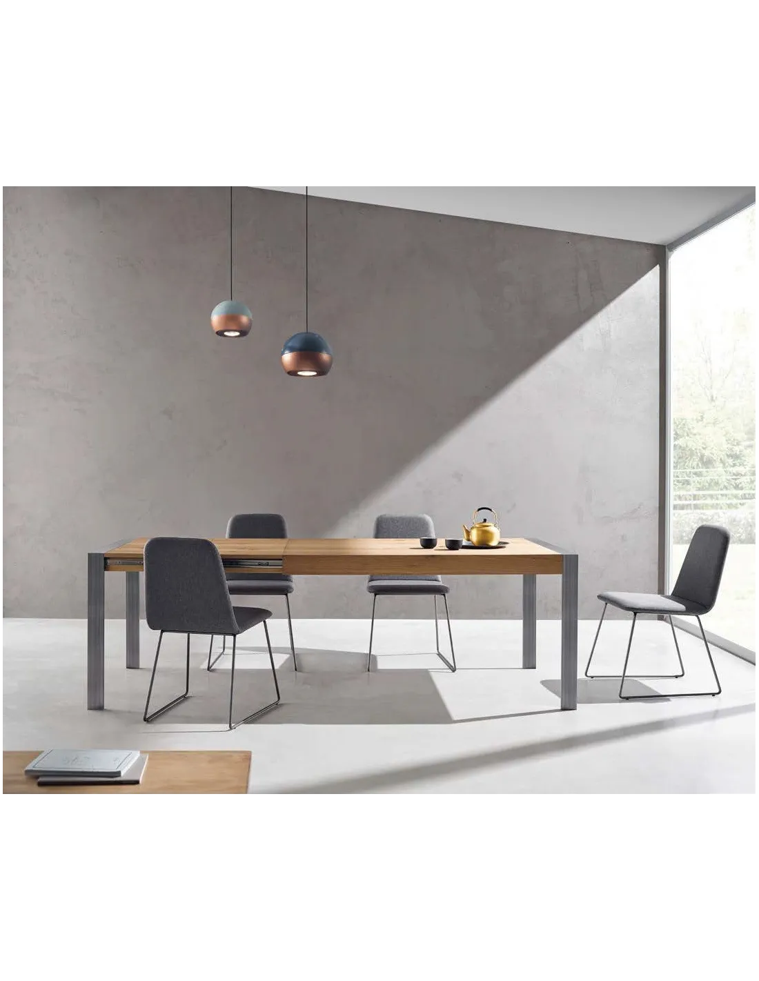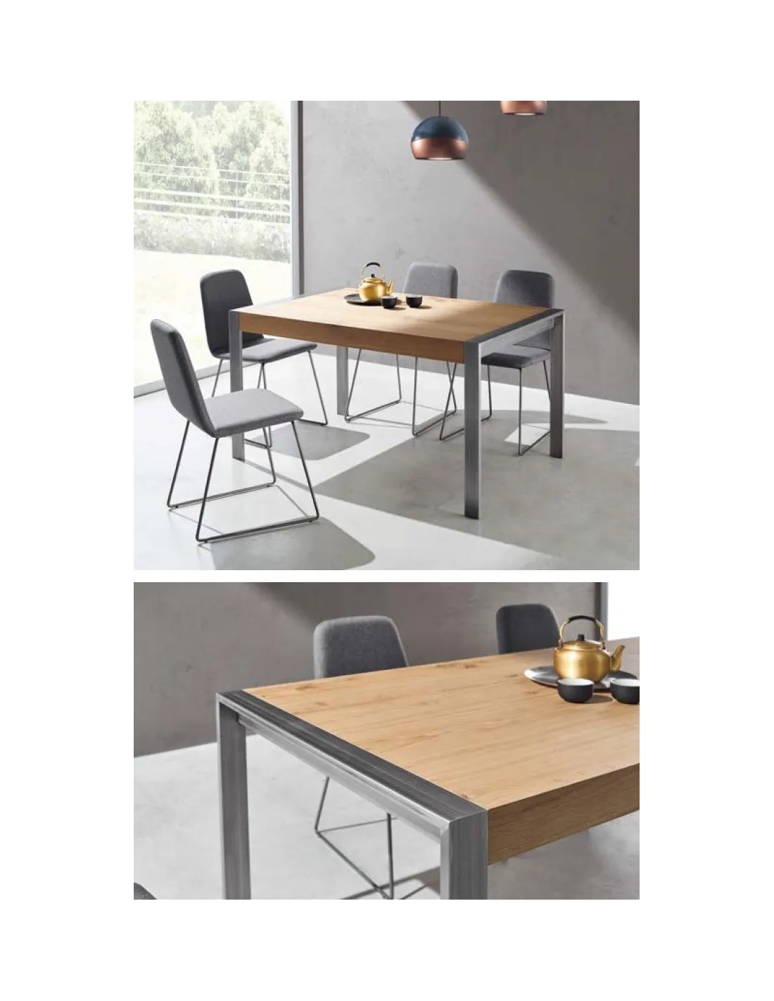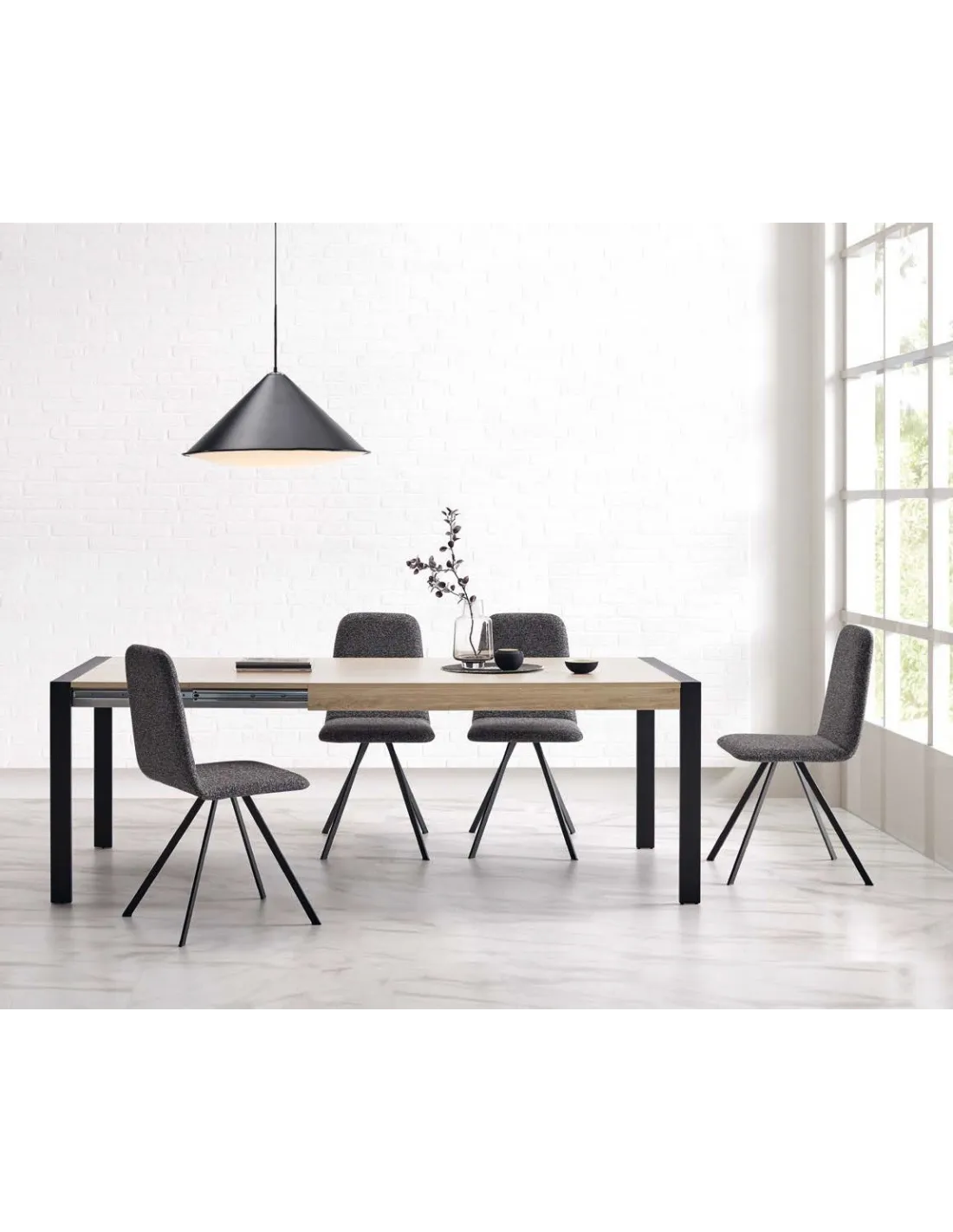 El pack de la mesa Tema extensible con sillas cuenta con varias medidas que aumentan 60 cm. gracias a su mecanismo extensible de carro, donde sus patas metálicas se deslizan sobre el suelo quedando situadas en los extremos de la mesa. En medida de largo 90 la extensión será de 40 cm.