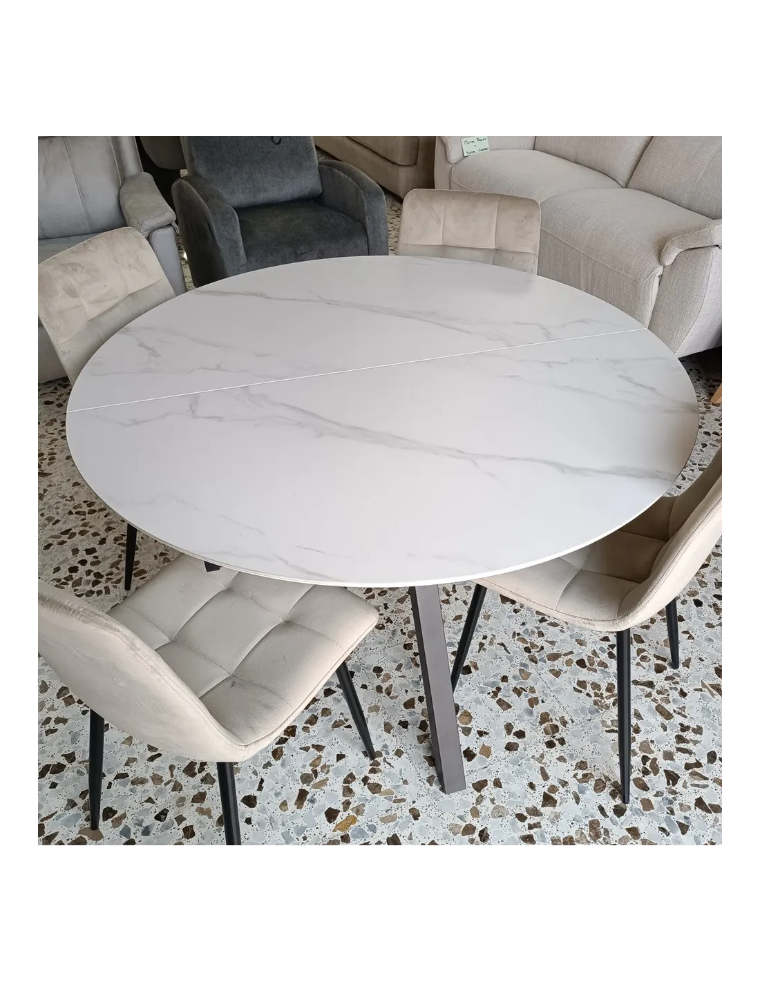 Mesa de comedor extensible Linda redonda con tapa porcelánica blanca