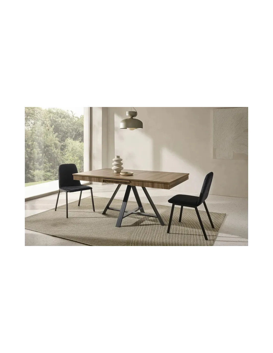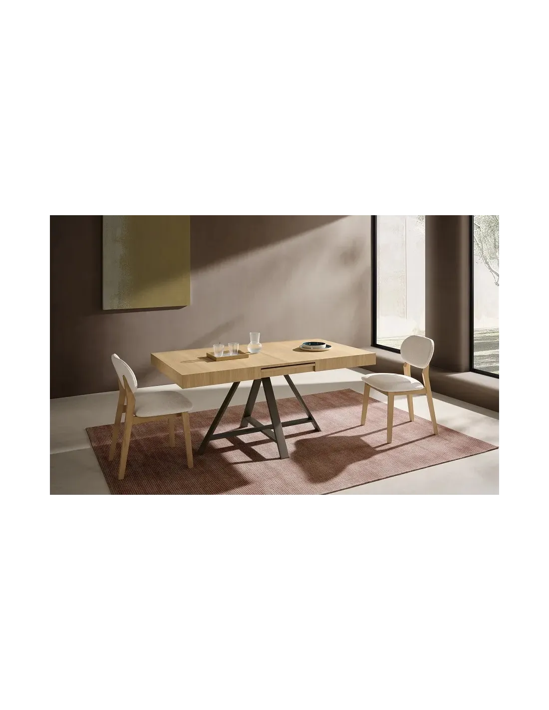 Mesa de comedor, con pie central metálico y extensible con apertura y cierre automático. Opción de tapa en melamina o chapas naturales.