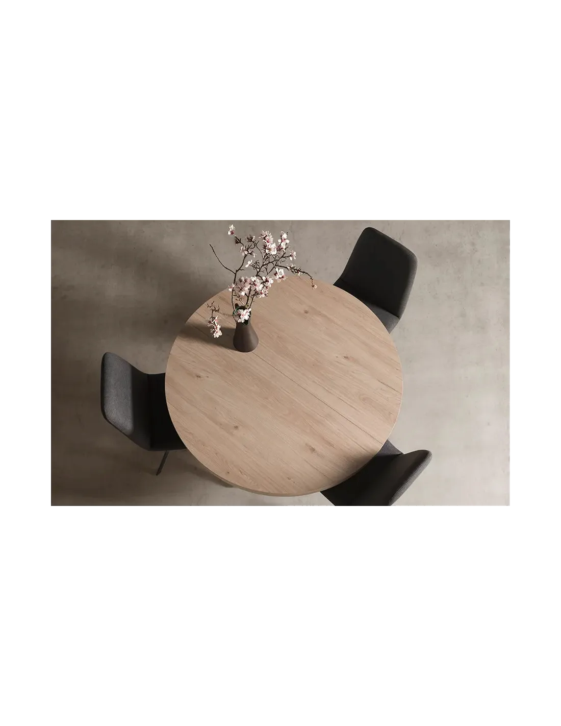 Esta mesa de comedor redonda están fabricadas con tablero de melamina con gran variedad de acabados disponibles en chapas de melamina con y sin poro. La pata es metálica, y viene disponible en tres acabados.