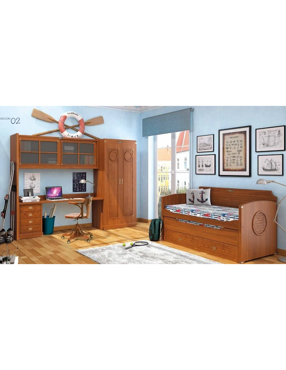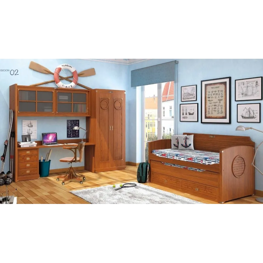 Este dormitorio juvenil madera de Fresno con compacta tiene unos acabados pulimentados y barnizados de primera calidad, con la posibilidad de elegir entre blanco decapado, nogal claro y nogal naútico, con los detalles del mueble y herrajes de latón pulido.