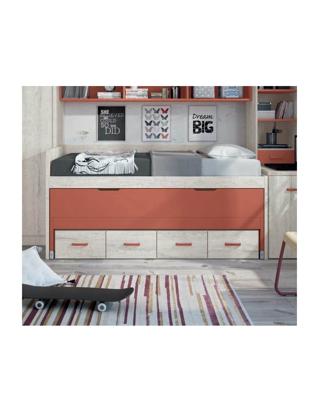 - CAMA COMPACTA CON DOS CAMAS DE 90X190 CM. La superior es fija y la inferior es de frontal alto con ruedas para extraerla y freno. Incluye guardera trasera de protección de pared.
