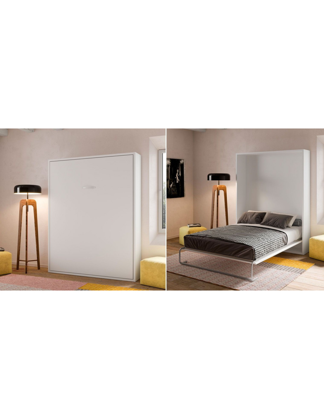 La cama abatible vertical sencilla Space de matrimonio está disponible para colchones de matrimonio en varias medidas (anchos de 135 a 160 cm. y largos hasta 200 cm.), y tienen estas medidas totales: