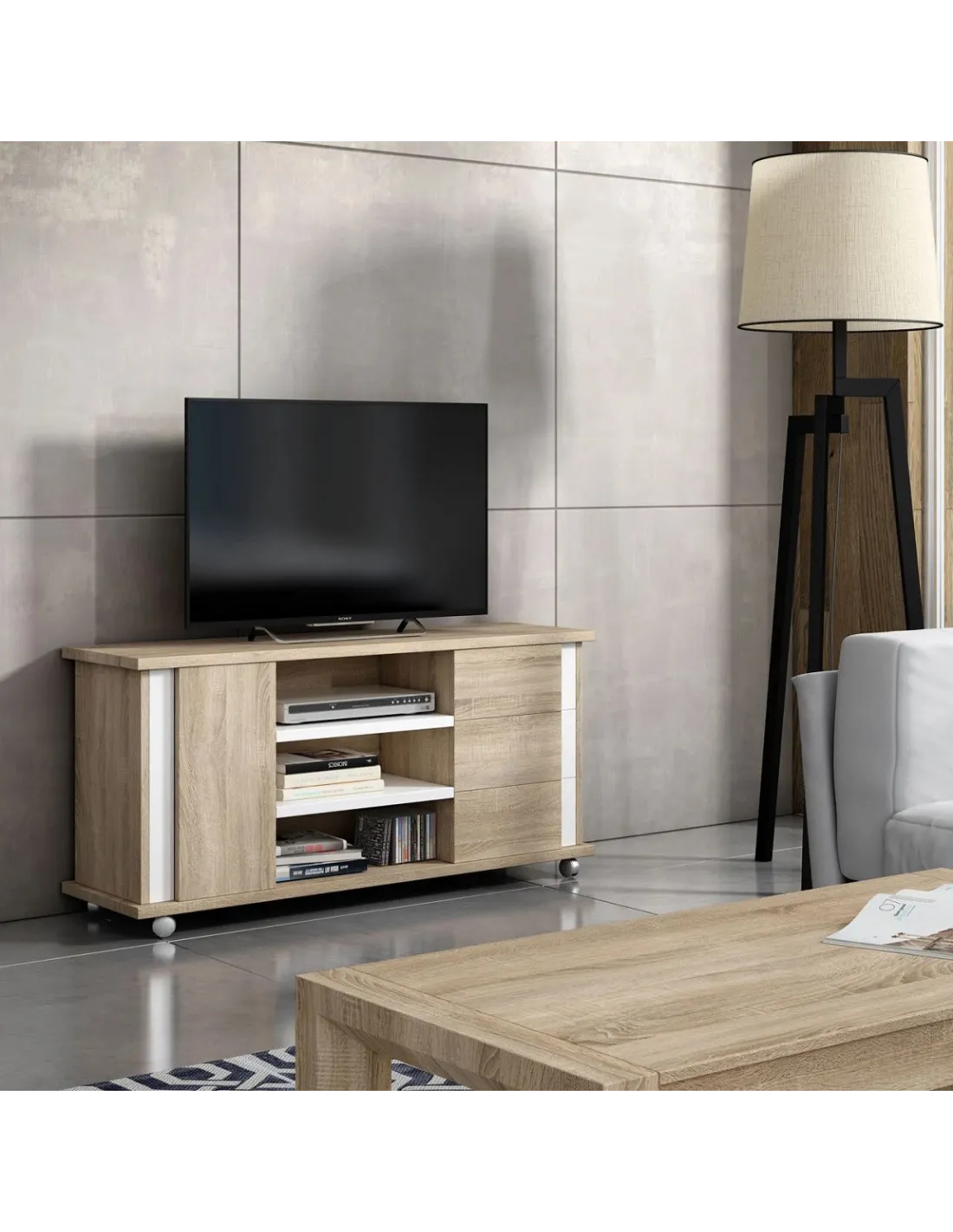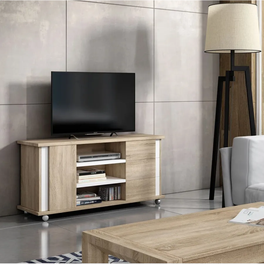 Mesa de tv con una puerta y tres cajones de diseño moderno y lineas rectas. Esta mesa además de móvil es muy funcional gracias a sus tres huecos centrales y sus cajones disponibles para almacenaje.