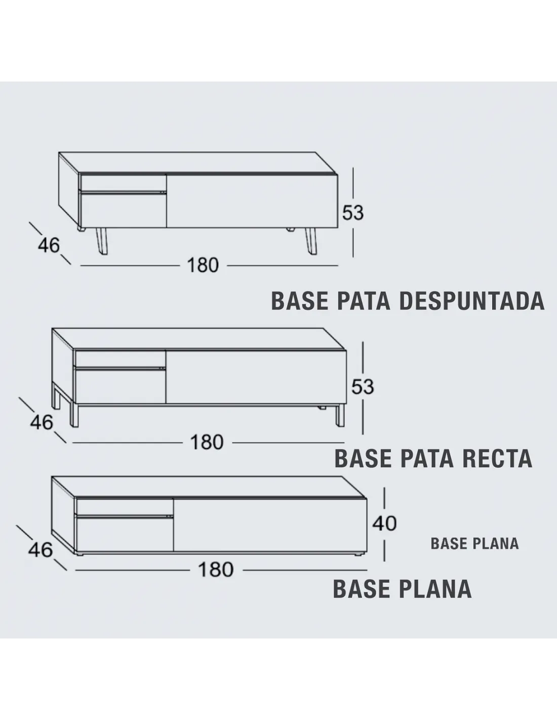 Este mueble TV de diseño moderno puede venir con la base despuntada, la recta o la base baja de 4 cm., cada una marcada a su precio. Además, se puede personalizar en dos series de colores, una de ellas son acabados barnizados y decapés y la colección de acabados lacados con un pequeño incremento de precio. Igualmente, puede optar por usar dos o más acabados para el mismo mueble.