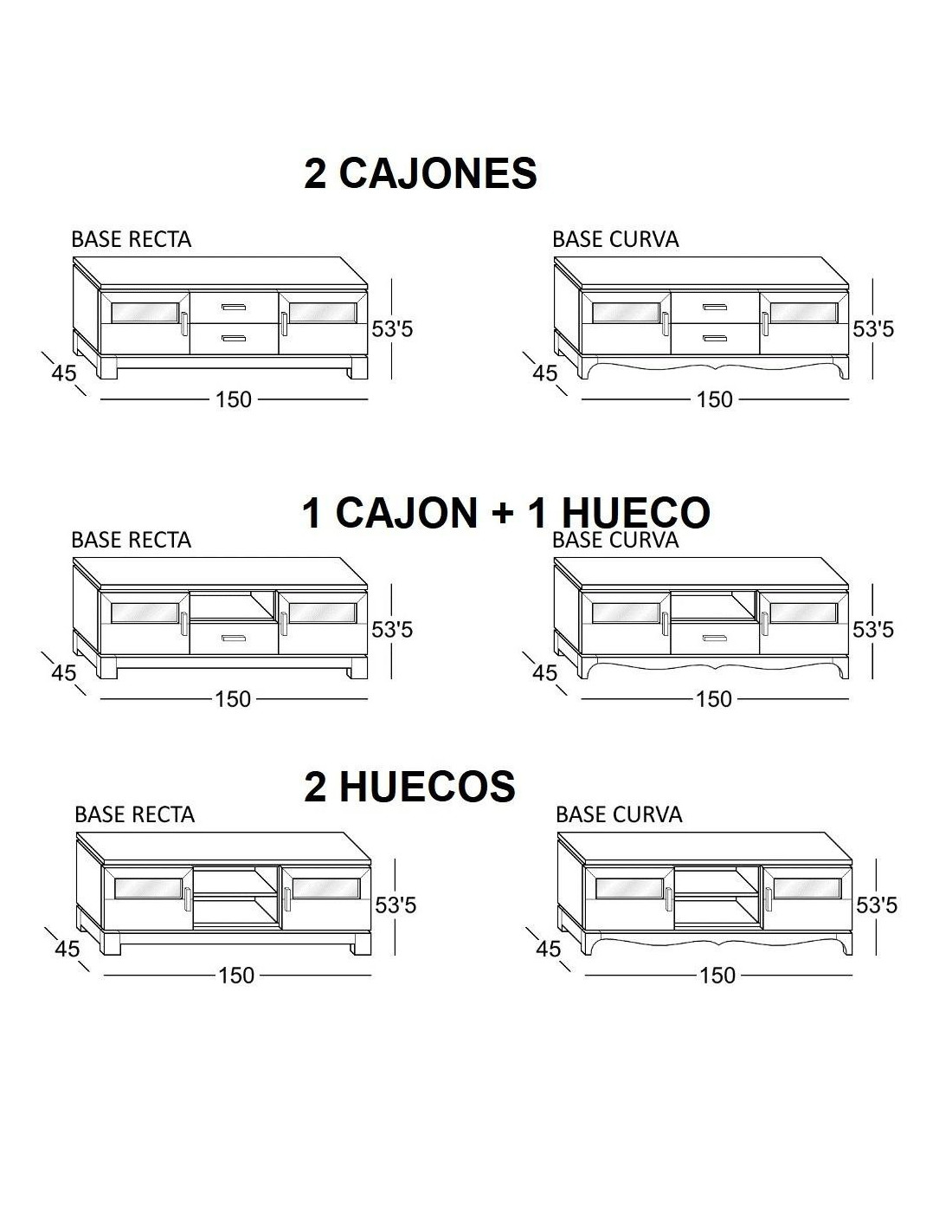 Este mueble 2P1C1H para TV 150 cm. se puede personalizar en base a su apariencia frontal, ya que puede optar por el mismo mueble compuesto por dos puertas + dos cajones, dos puertas + un cajón + un hueco o dos puertas + dos huecos, todos ellos al mismo precio.