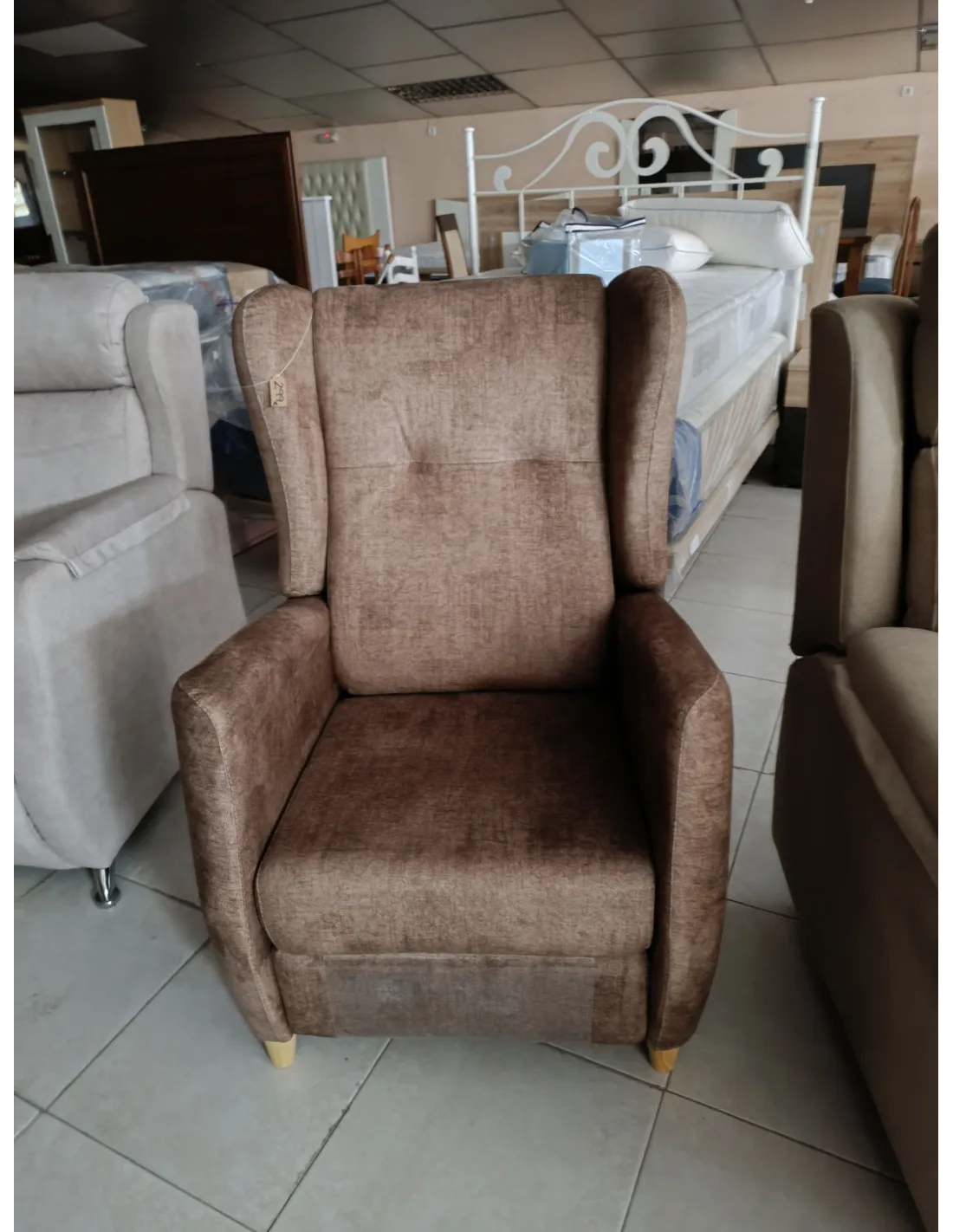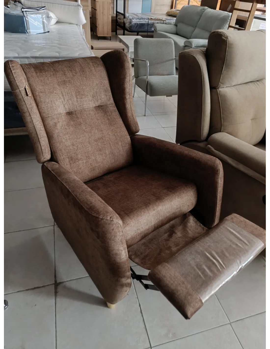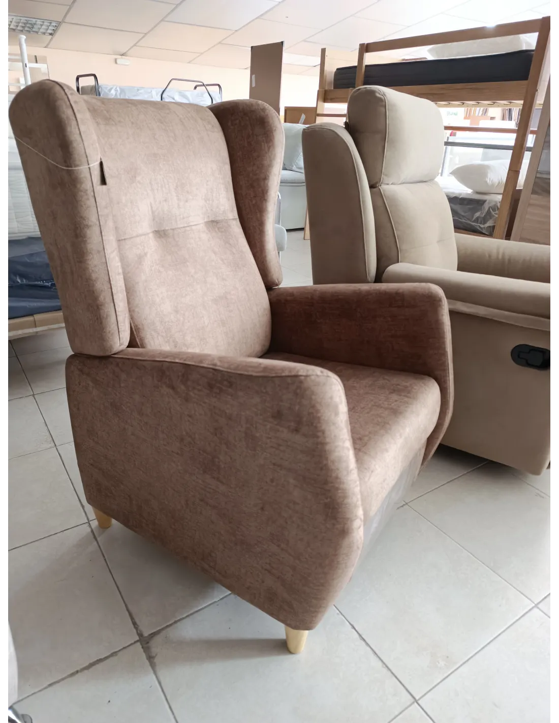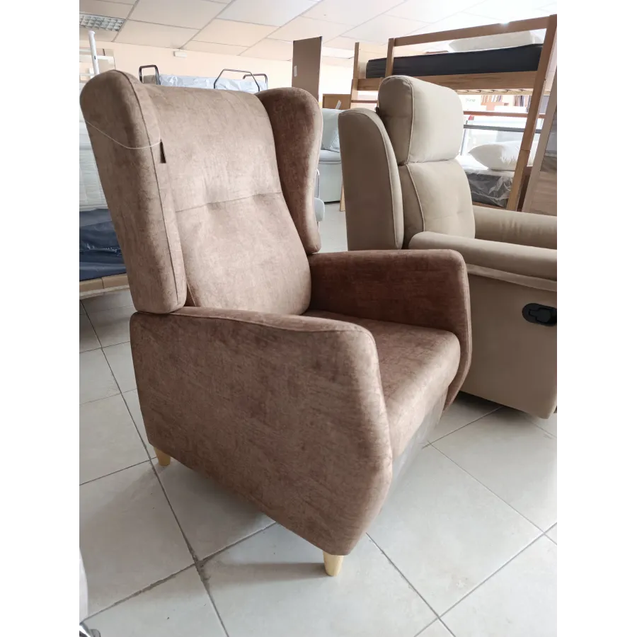 Silllon tapizado antimanchas con pata alta de madera y sistema de apertura relax automática por empuje.