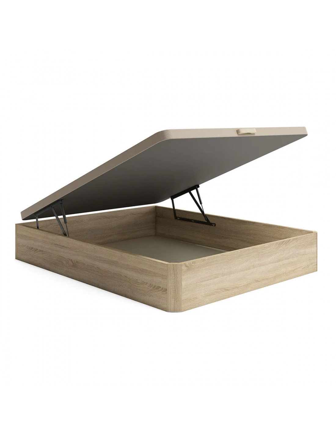 Base tapizada 3D beige con tablero y marco metálico con largueros interiores de refuerzo. Tirador de madera (2 en medida a partir de 150 cm. de ancho).