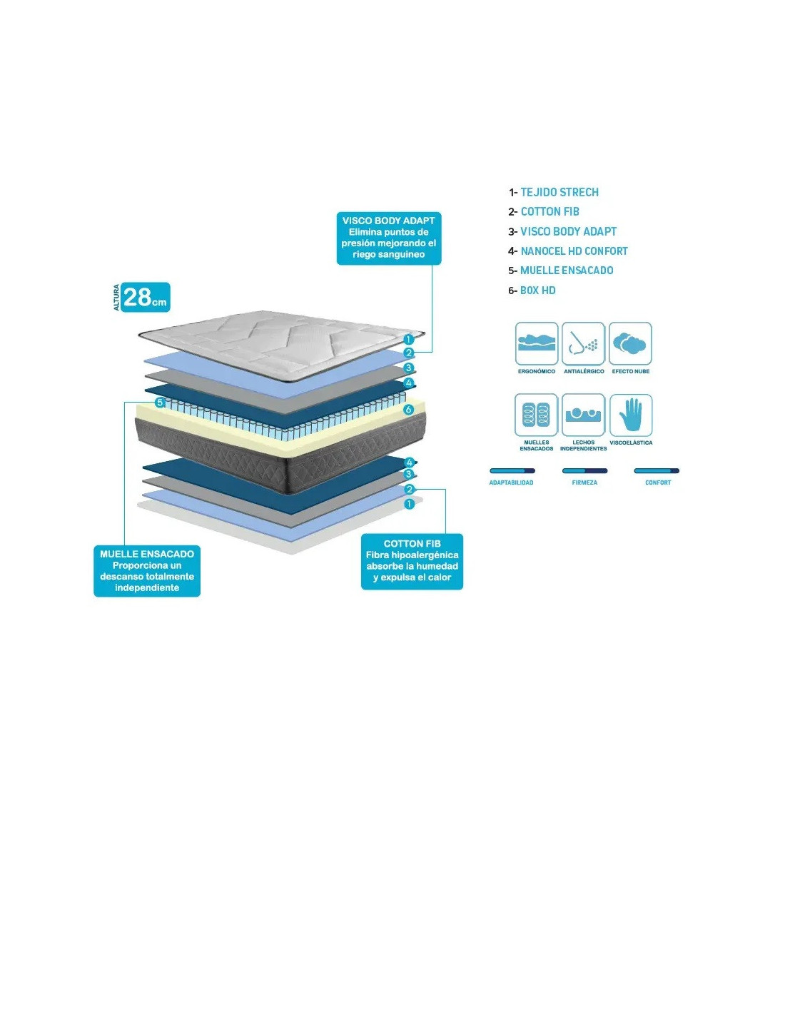 Colchón sin muelles viscoelástico con núcleo de muelle ensacado de alto total 28 cm. Es un colchón terminado igual a ambas caras, con las siguientes capas: