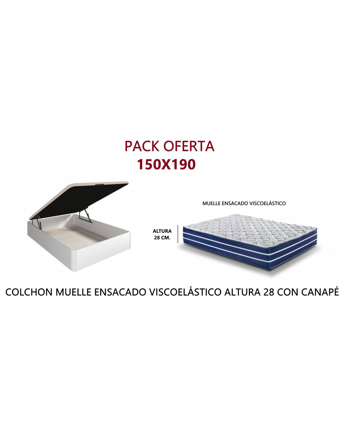 Pack de oferta compuesto por canapé de madera de 150x190 cm. + colchón Muelle Ensacado Viscoelástico de 28 cm. de altura