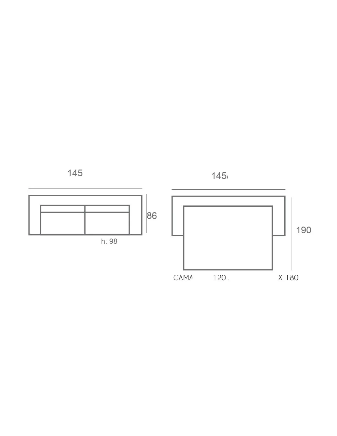 - Sofá cama Sonia 145: colchón de 120x180 cm. - largo total 145cm. - altura 98 - fondo 86 cm.