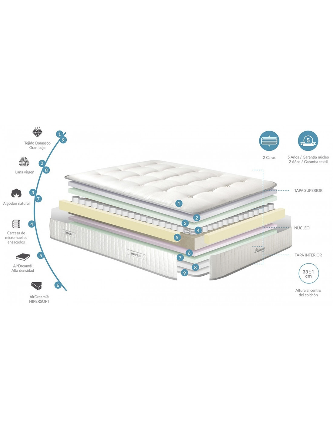 Multiplica las fantásticas características propias del sistema ensacado, aumentando el confort y la adaptabilidad, proporcionando una ergonomía insuperable, gracias a sus 1.876 muelles en la medida de 150x190cm. Perfecta independencia de lechos. Máxima transpiración y flexibilidad. Tapizado en tejido Damasco gran lujo con soporte de lana virgen y algodón natural.