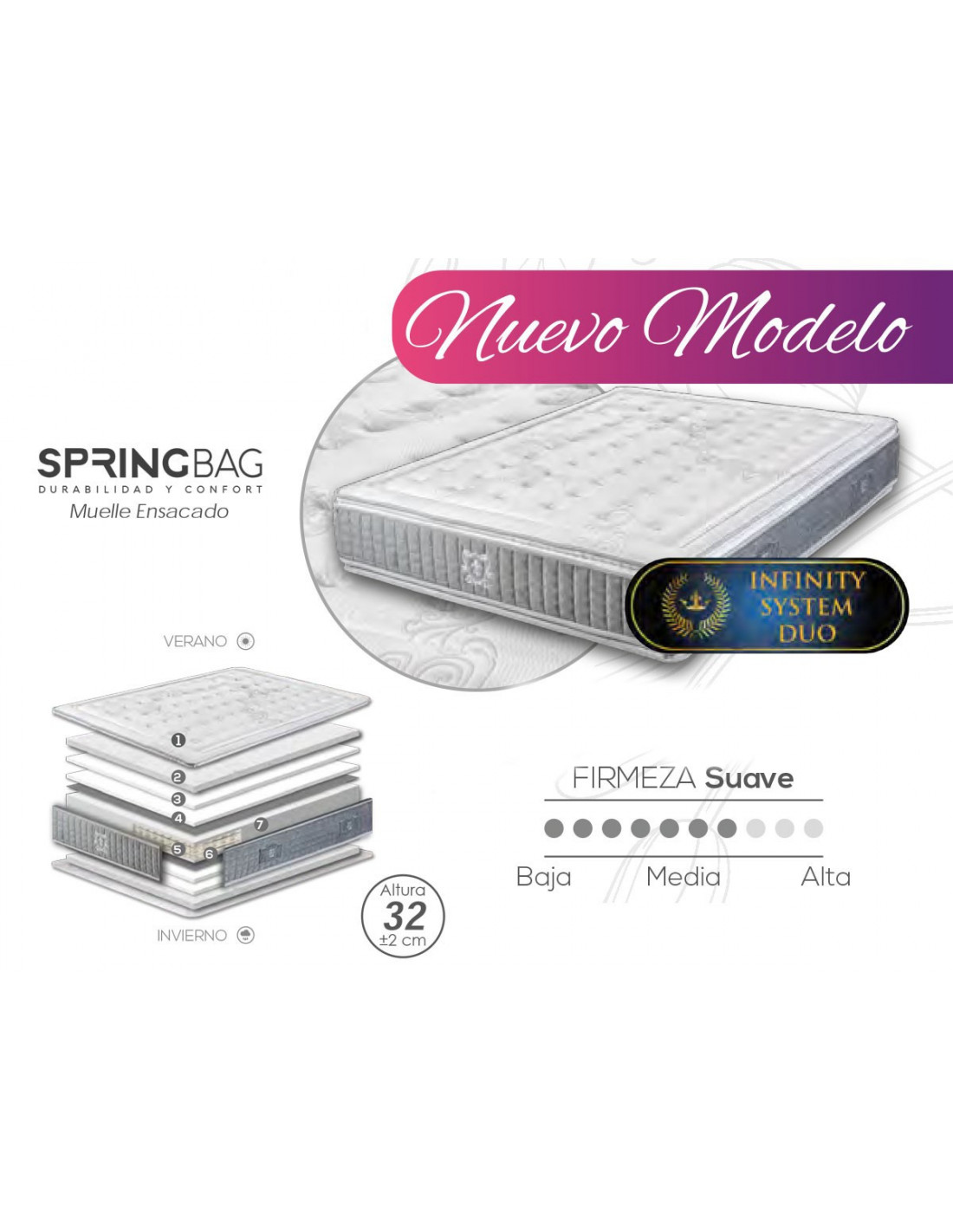 En este colchón, además, esta carcasa de muelles embolsado viene dotada del sistema Infinity System Duo; este sistema consigue evitar un excesivo hundimiento de la carcasa de muelles gracias a su sistema de refuerzo mediante doble varilla de contorno, lo cual le aporta mayor estabilidad, durabilidad y una sensación de independencia de lechos perfecta.