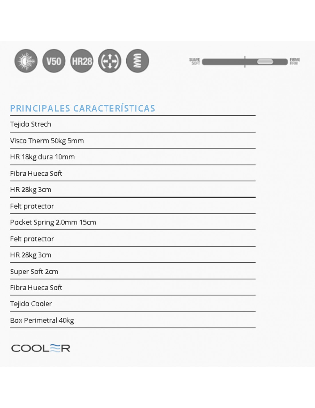 Para el acolchado cuenta con espuma supersoft en ambas caras y viscoelástica, tapizado en su exterior con el Tejido Cooler que mejora la disipación de calor proporcionando una tumbada suave y fría