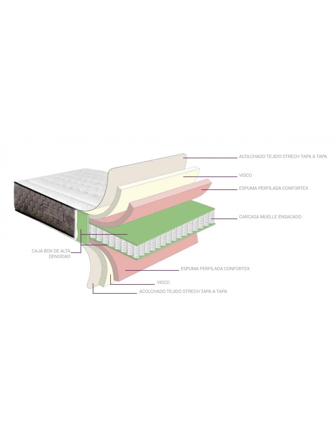 Independencia de lechos que dota de total libertad de movimientos y de una gran adaptabilidad al cuerpo y, junto al laminado en diferentes capas de visco suave, consigue un alto grado de confort, además de contar con la posibilidad de usarlo por ambas caras; se nos presenta con laminados en perfil confortex, lo que proporcionará un efecto masaje y favorecerá la total relajación. Acolchado artesanal tapa a tapa y con tejido Velour en la platabanda lo dotan de un aspecto elegante y moderno que encaja perfectamente en cualquier entorno.