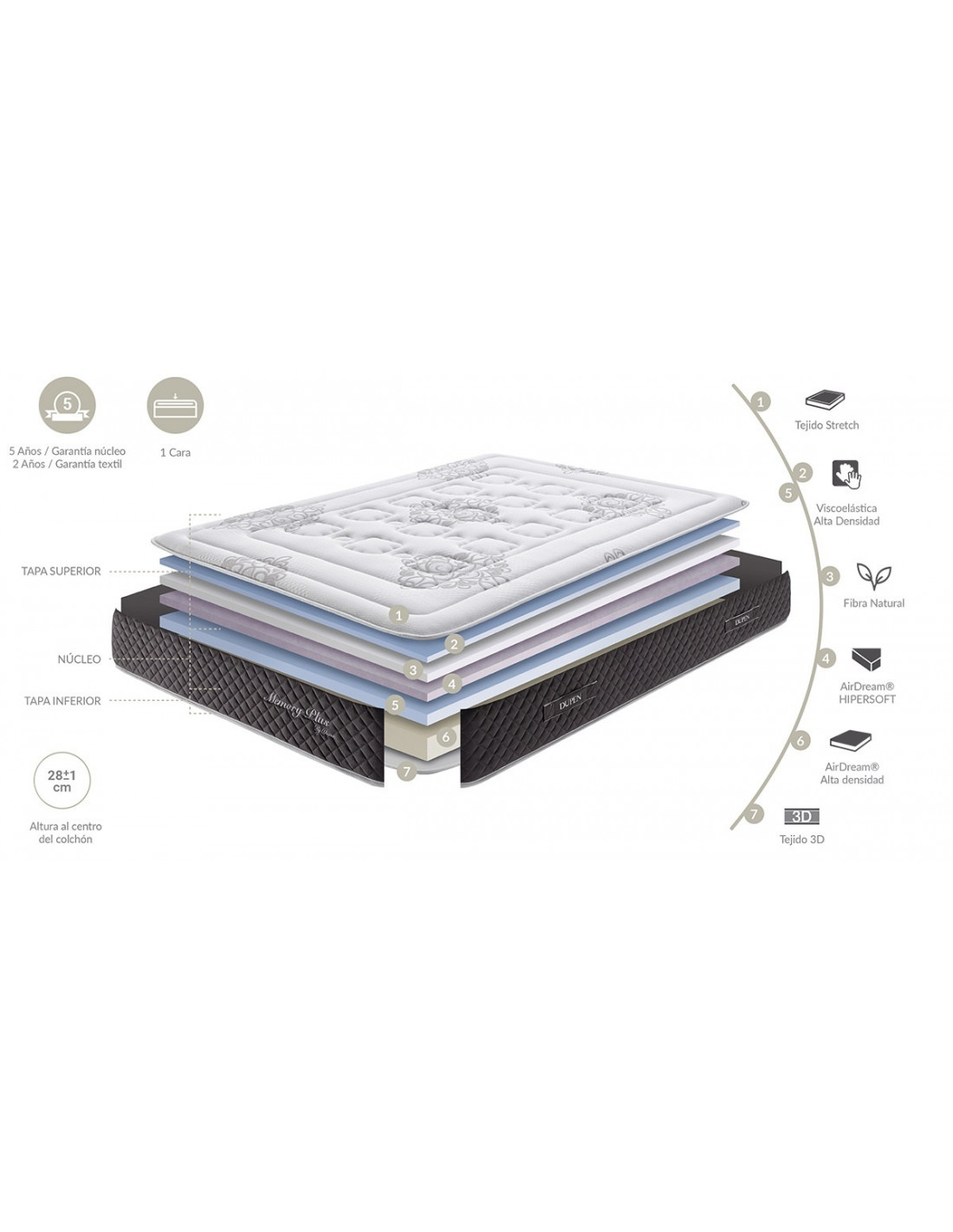 El colchón viscoelástico de Dupen Memory Plus de gama alta se distingue por los 6 cm de viscoelástica en una cara y su núcleo de HR alta densidad.