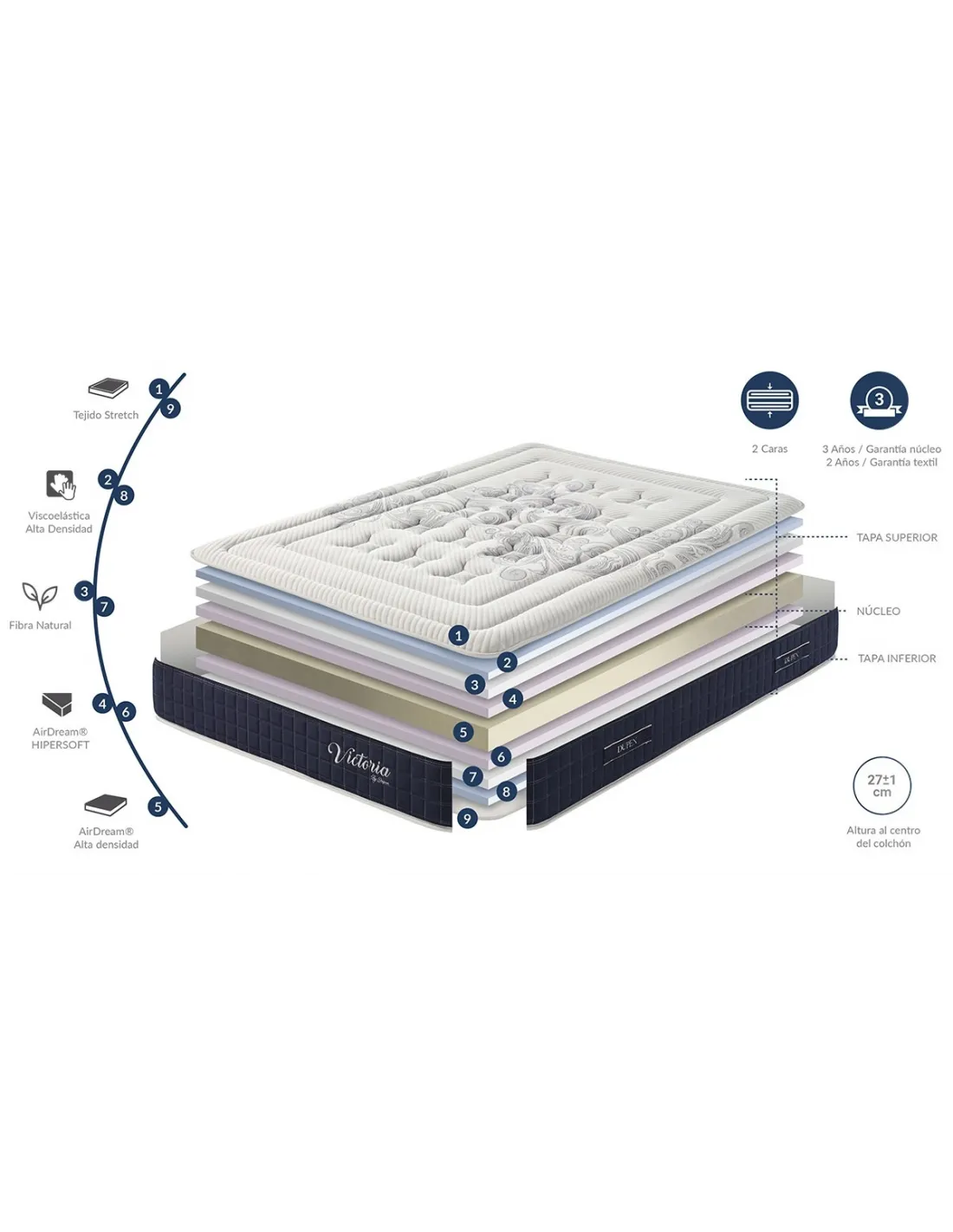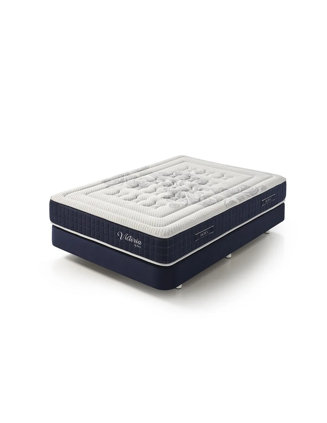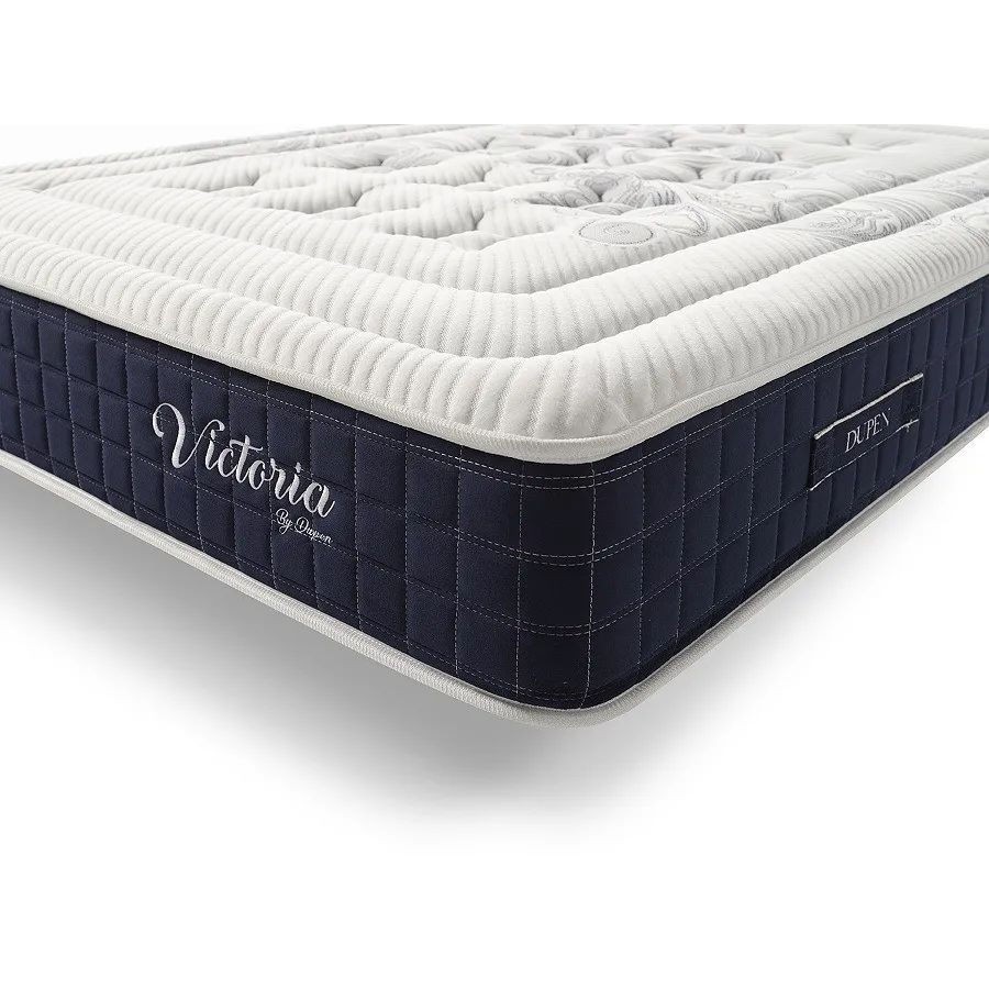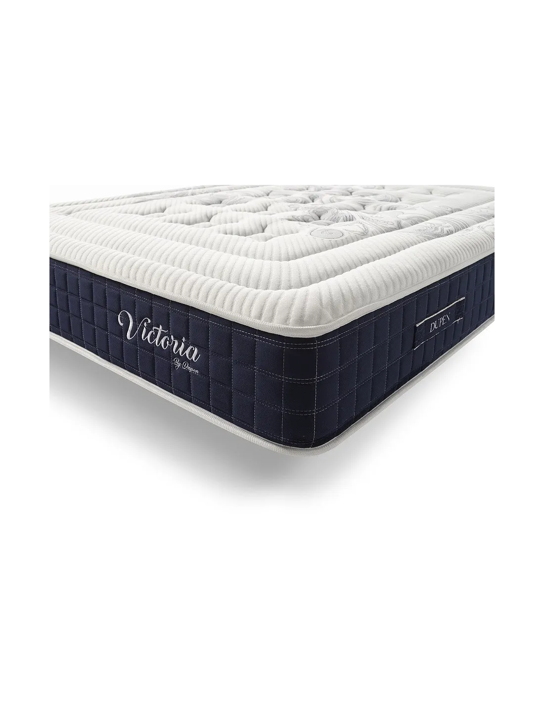 El colchón Dupen Victoria tiens las capas externas tienen un acolchado de 2,5 cm de viscoelástica en cada cara, una cara de verano y otra para invierno, tejido strech de alta calidad con aloe vera y todo con tratamiento antiácaros para evitar problemas de alergias a los ácaros. Producto de alta calidad con acabado tapa tapa y burlete con doble cosido.