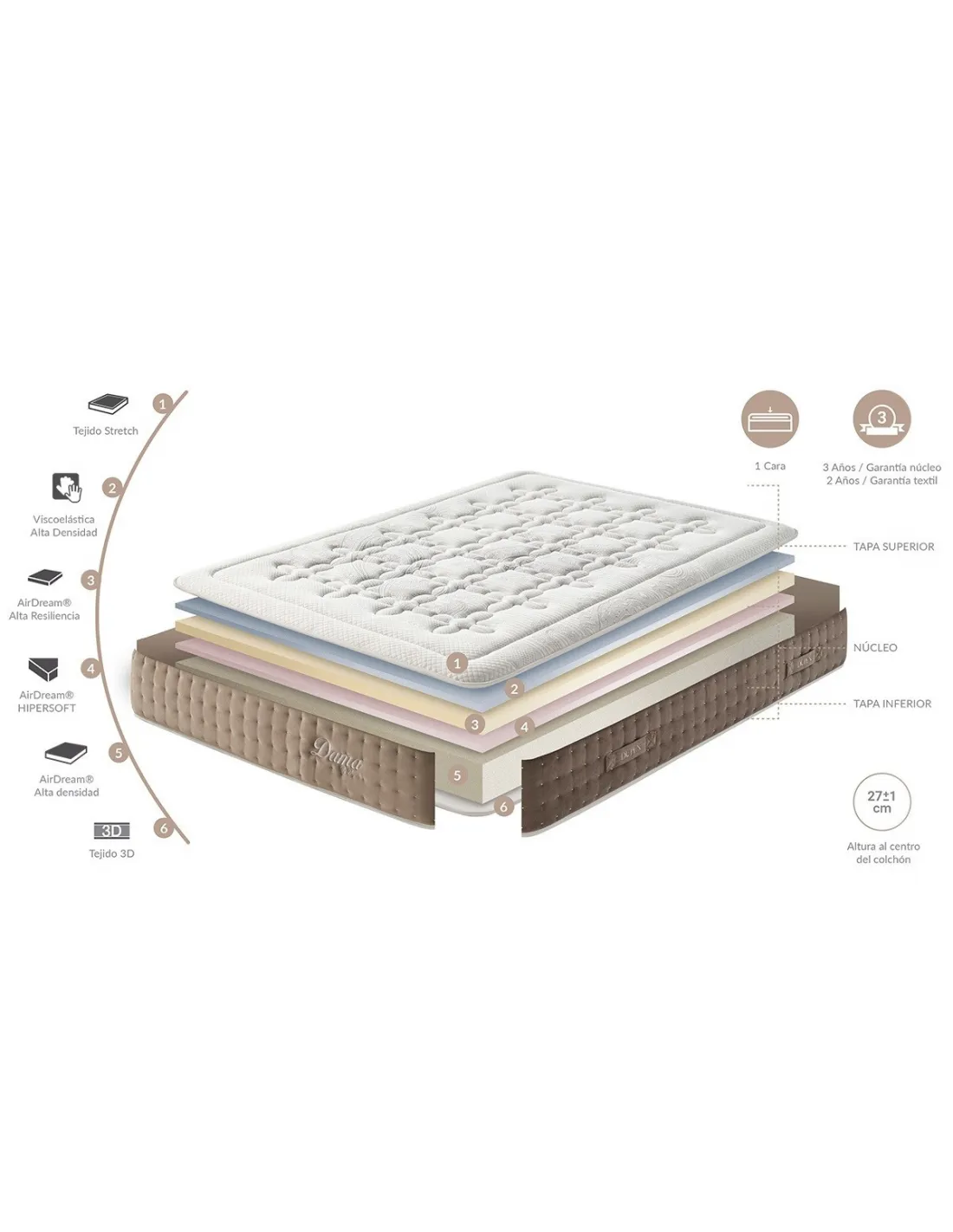 Colchón Dupen Dama fabricado con núcleo Airdream de alta calidad en combinación con 2 cm. de viscoelástica, además de poseer un acolchado viscoelástico de 2 cm.