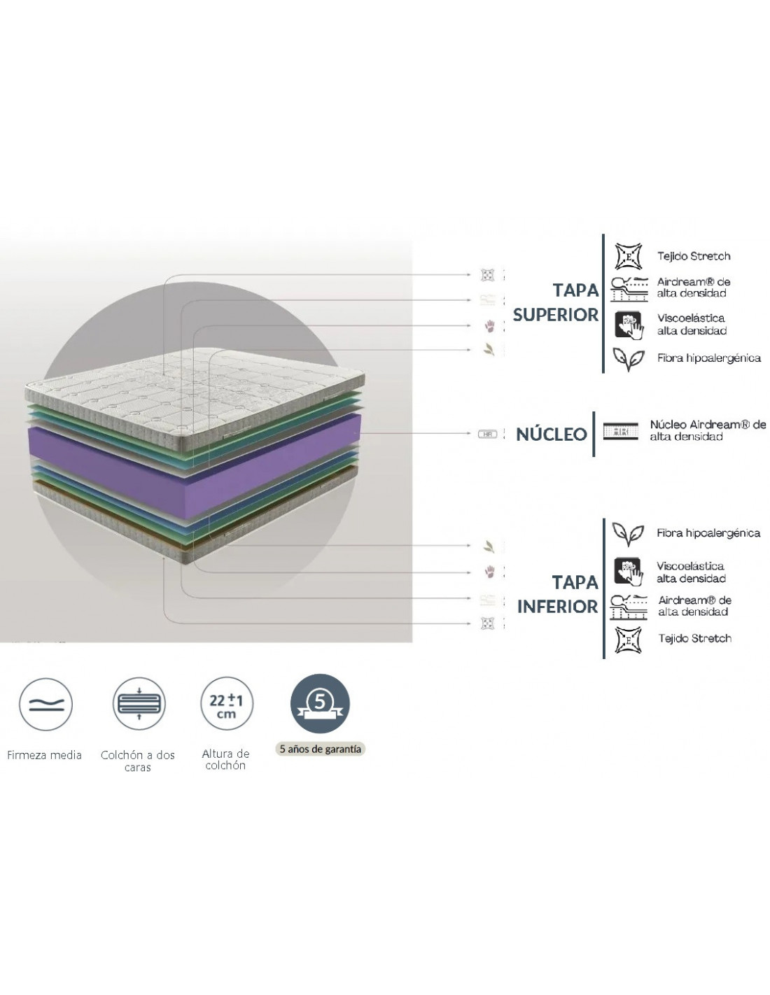 Su núcleo Airdream® de alta densidad distribuye el peso del cuerpo para un confort máximo, aportando una total independencia del descanso. Platabanda rellena de fibras hipoalergénicas, cuatro asas horizontales de lujo bordados y acolchado exclusivo.