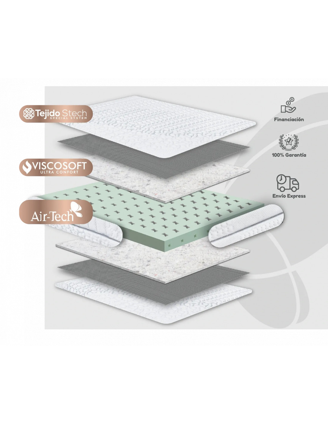 El colchón Airflexi destaca por su núcleo Air-Tech (Air Technology) que proporciona una ventilación máxima, permanente e higiénica, además de una superficie firme pero flexible gracias a sus 65 Kg/m3 de densidad, que aportan al colchón un grado óptimo de firmeza.