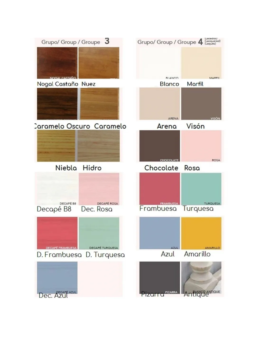- gama de colores barnizados y lacados disponibles para su elección