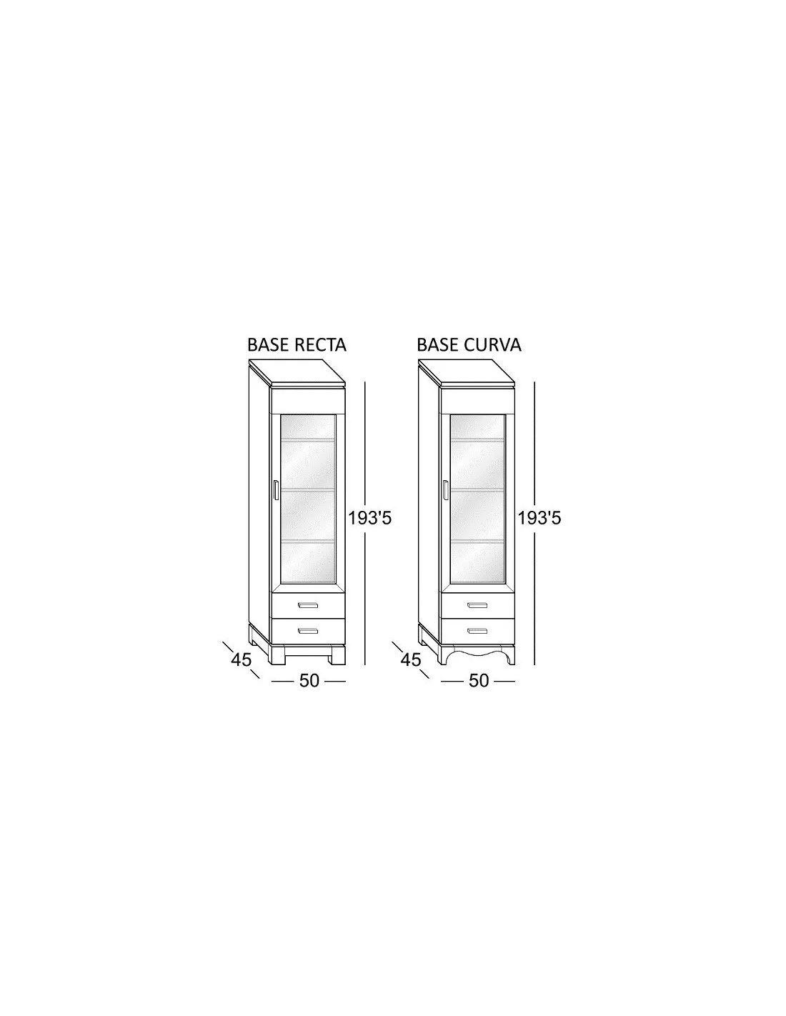 Esta vitrina alta con puerta y cajones se puede personalizar primero en su apariencia, pudiendo optar por una base de apoyo a suelo con acabado curvo o recto , lo cual nos da toques de diferencia en el mueble. Además, podrá elegir entre varios modelos de tirador al mismo precio
