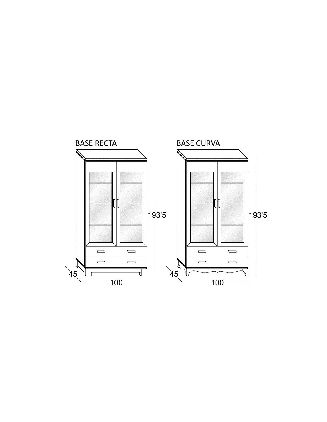 Este módulo vitrina alta con dos puertas y cajones tiene las siguientes medidas (alto x largo x fondo en cm.): 193,5 x 100 x 45.