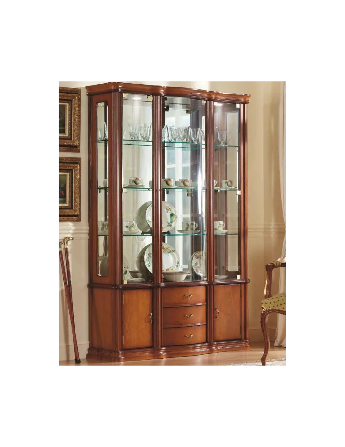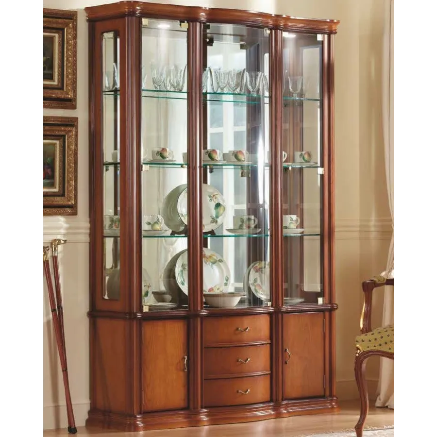 Esta vitrina clásica tres cuerpos en madera de cerezo viene en dos medidas de largo disponibles con la misma configuración y las siguientes medidas: