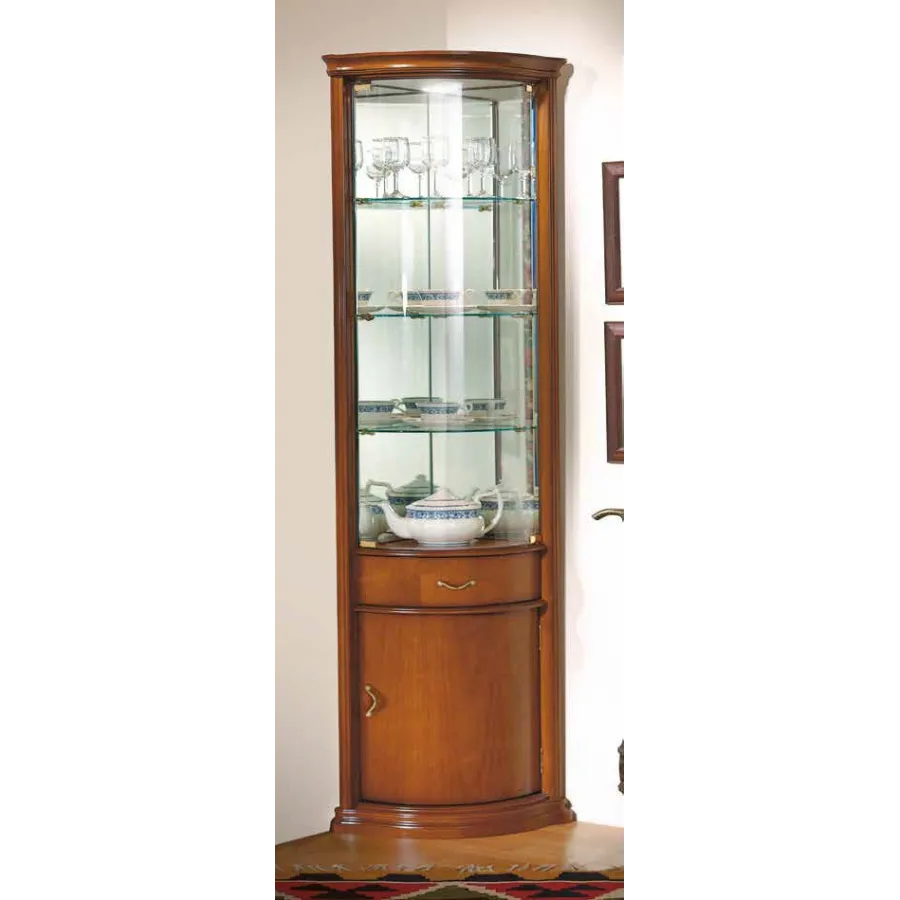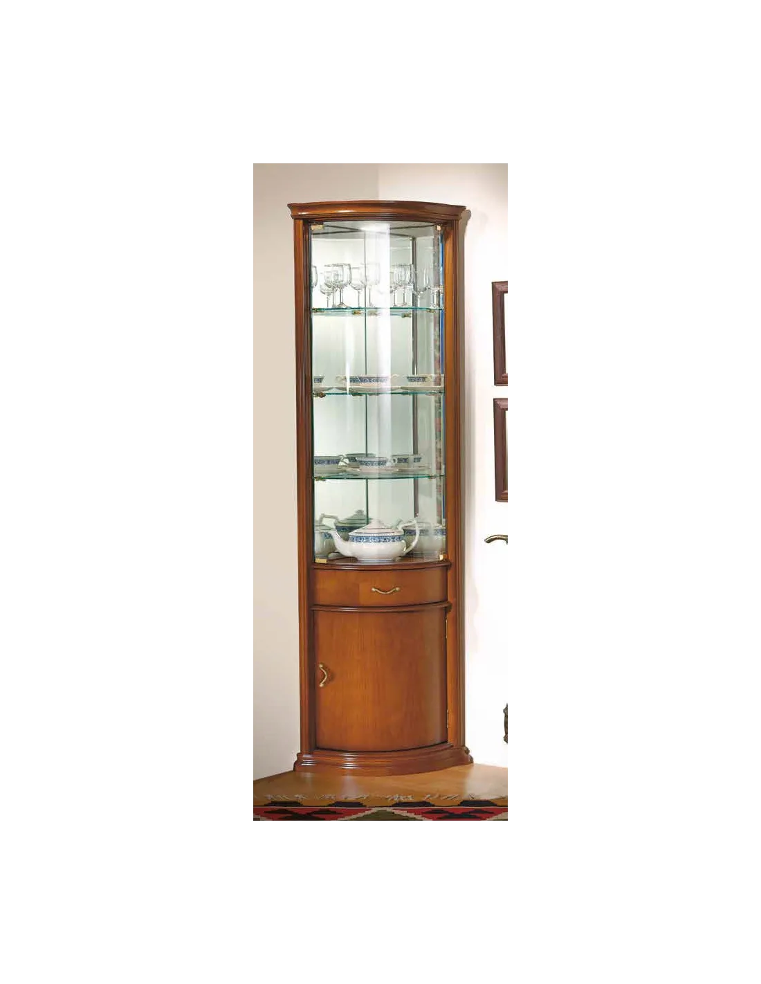 Vitrina dos puertas un cajón de rincón en madera cerezo de diseño clásico