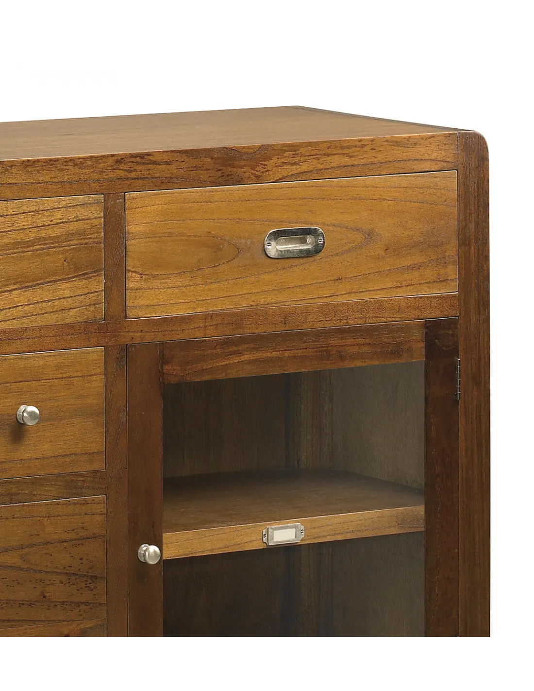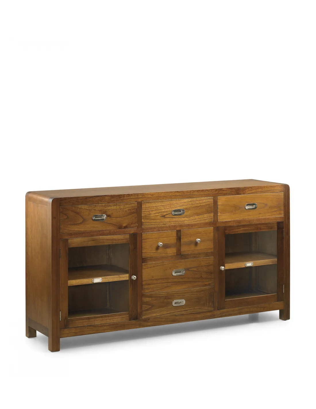 Buffet aparador fabricado en madera maciza de Mindi con inconfundible diseño colonial con cajones y puertas.