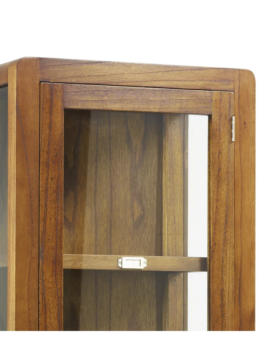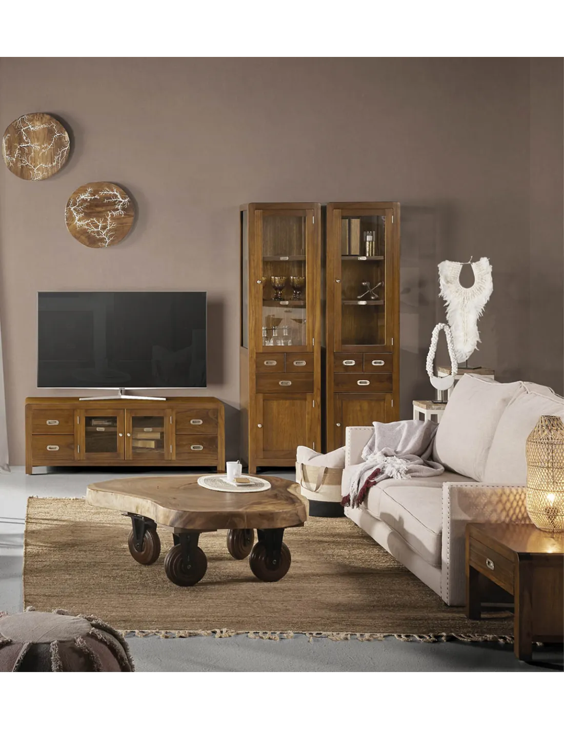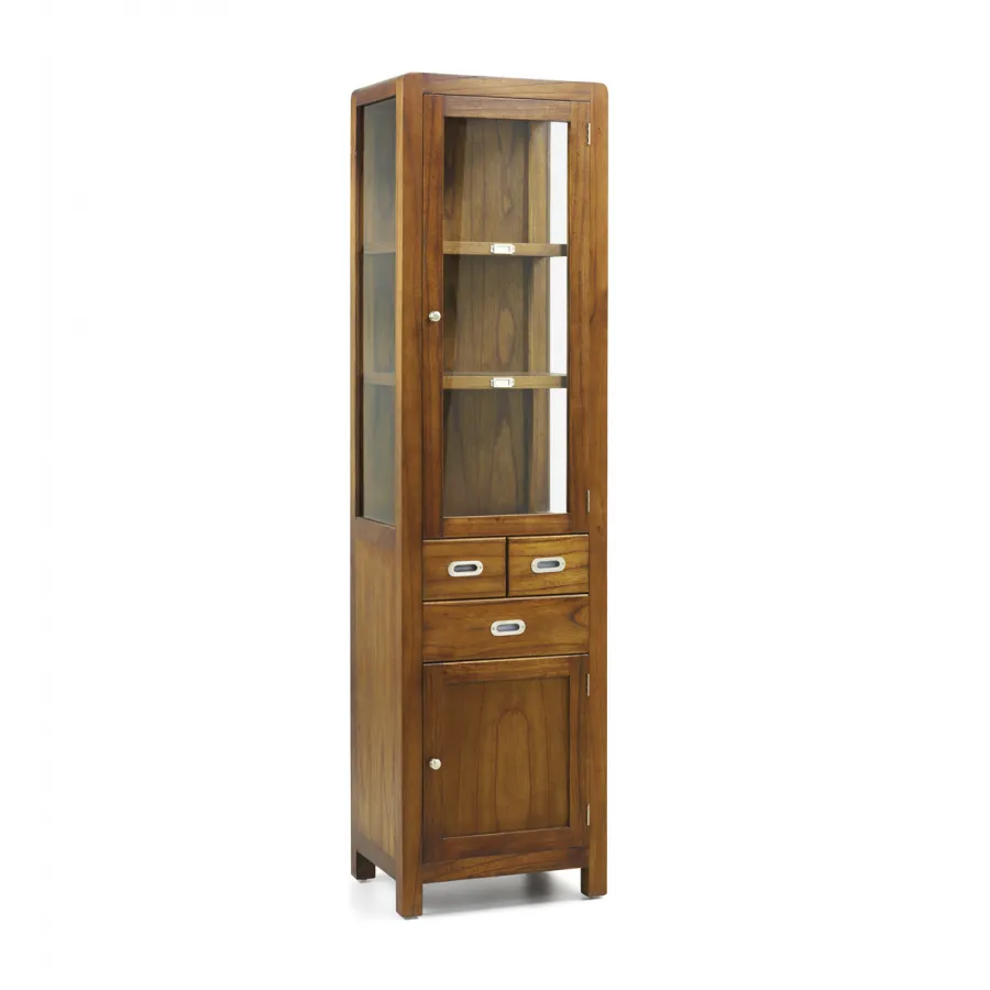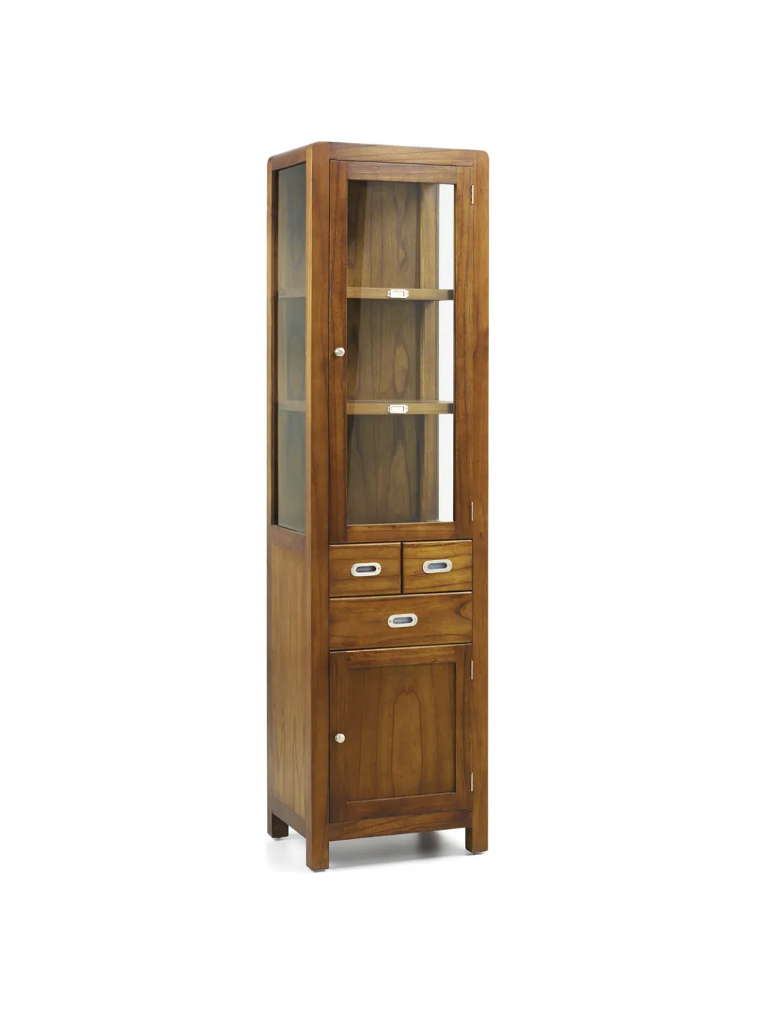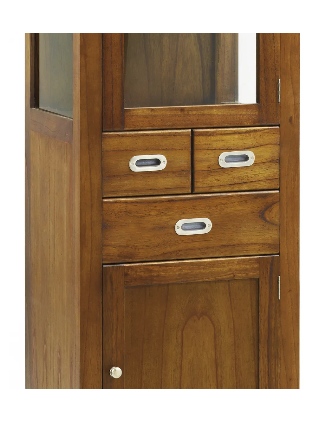 Vitrina fabricada en madera maciza de Mindi con inconfundible diseño colonial con cajones y puertas