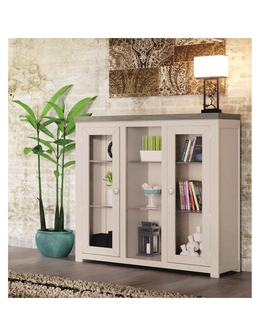 Este modelo de mueble expositor de salón colonial Asturias puede venir en varias terminaciones lacadas y barnizadas a su elección: