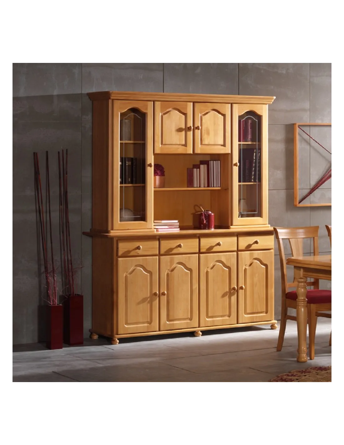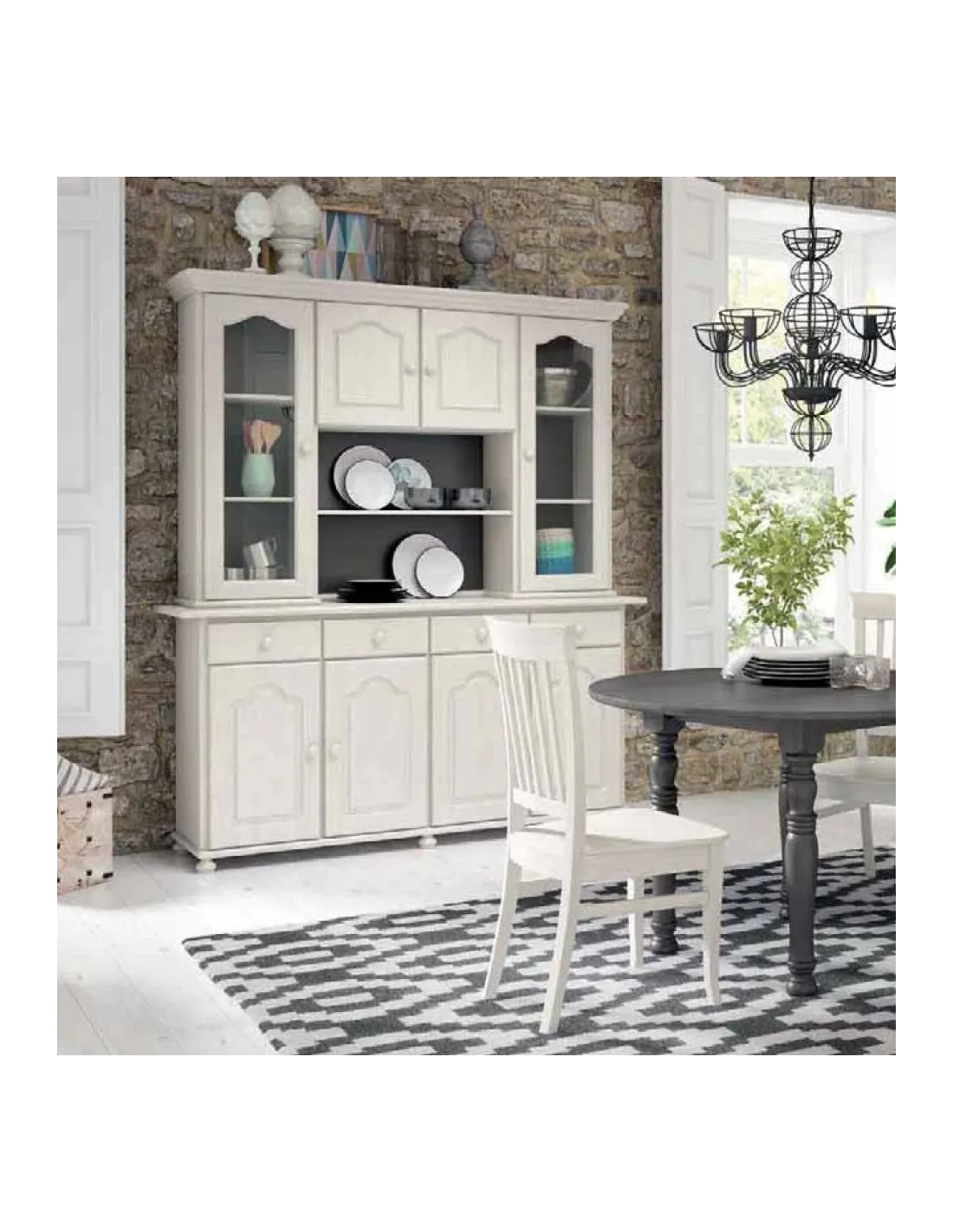 Vajillero para comedor en estilo provenzal con dos vitrinas fabricado en madera maciza de pino y de fabricación española. Disponible en una amplia serie de colores con terminación barnizada y lacada, así como en varias medidas tanto de ancho como de largo.