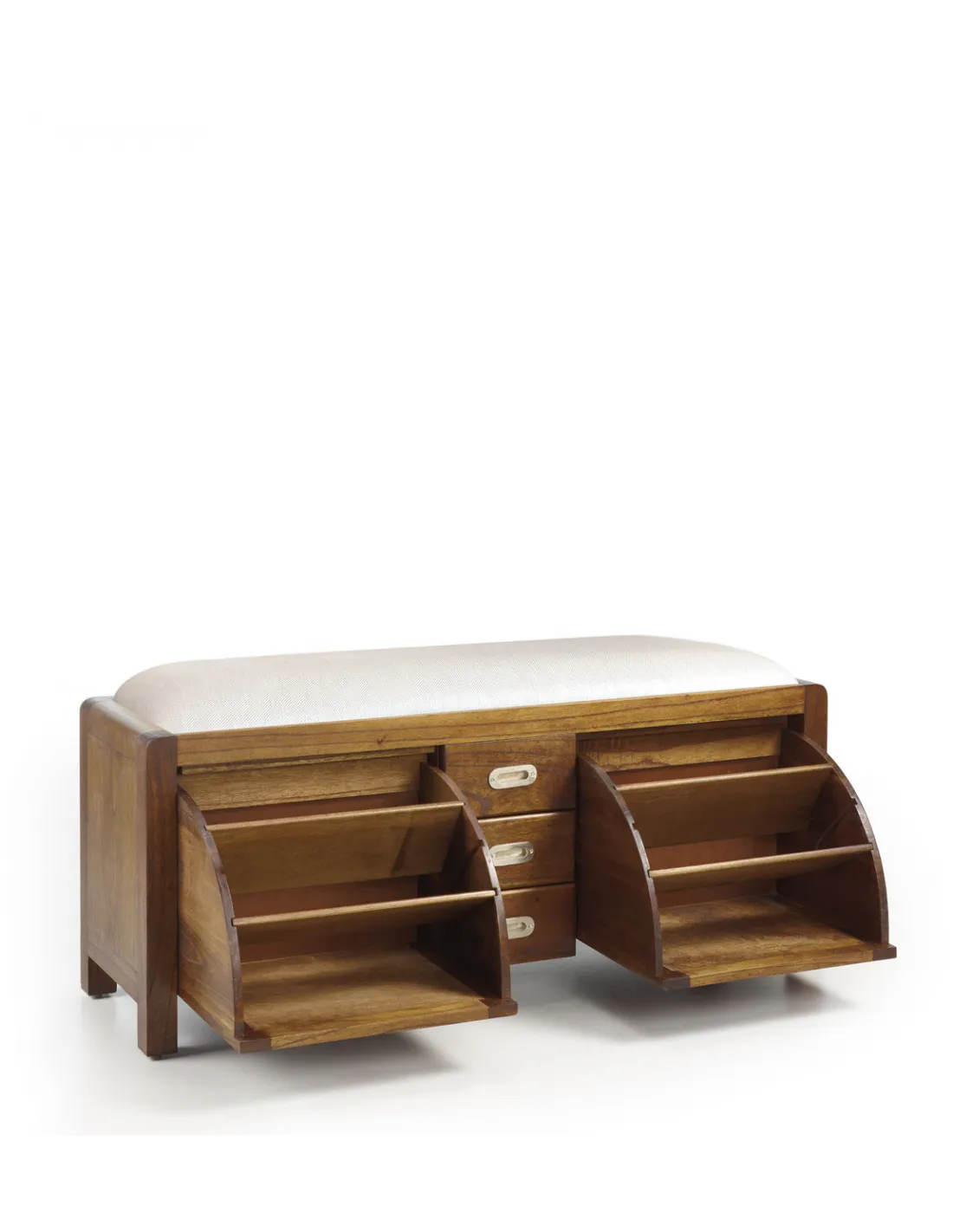 Banco zapatero fabricada en madera maciza de Mindi con inconfundible diseño colonial con cajones y puertas