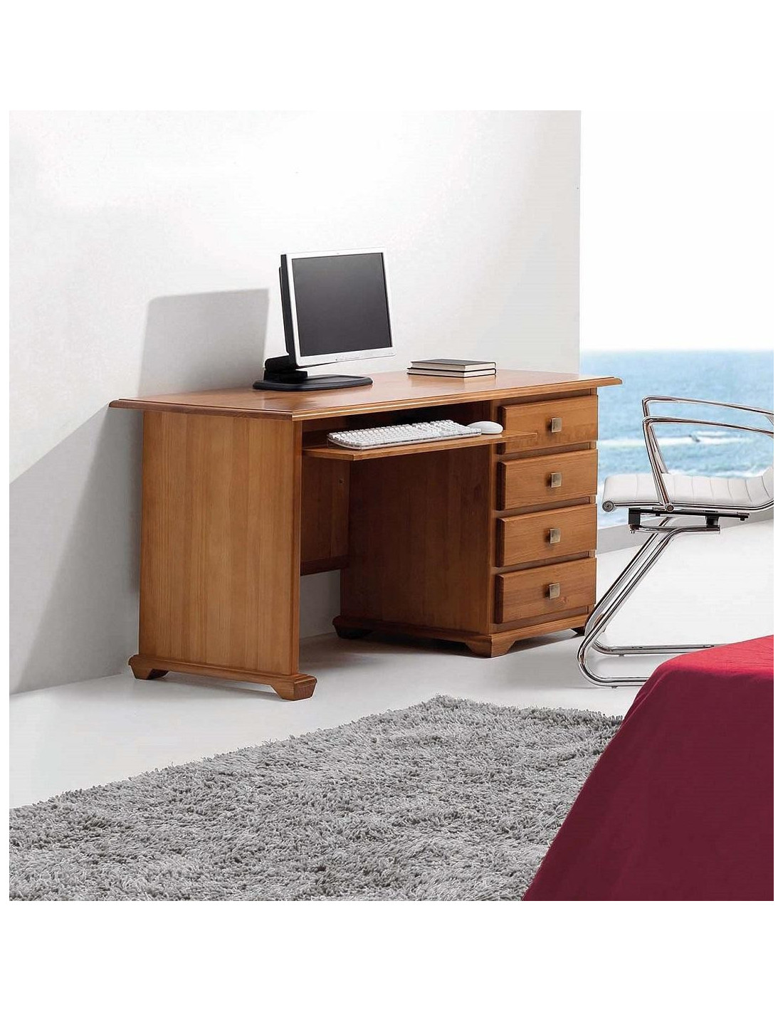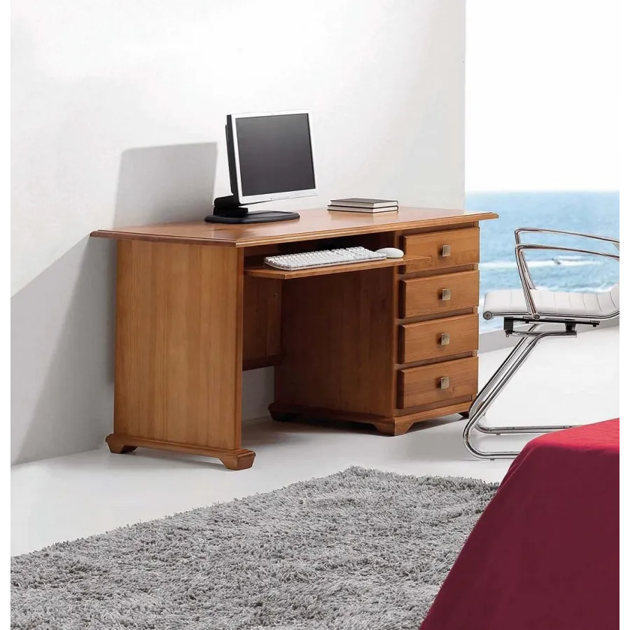 Este escritorio colonial 100 madera maciza tiene dos versiones con cajonera, una más grande con bandeja de teclado incorporada. Vienen con las siguientes medidas de alto x largo x fondo: