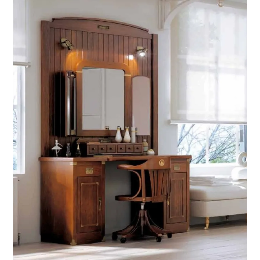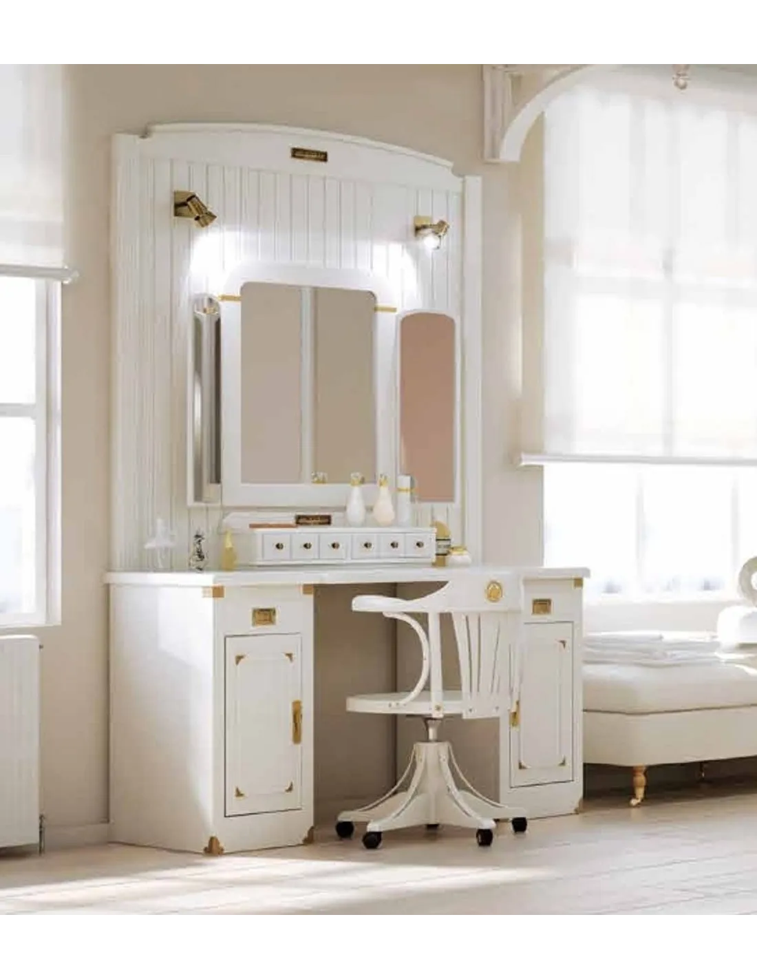 Esta mesa tocador Camarote tiene unos acabados pulimentados y barnizados de primera calidad, con la posibilidad de elegir entre blanco decapado, nogal claro y nogal naútico, con los detalles del mueble y herrajes de latón pulido.