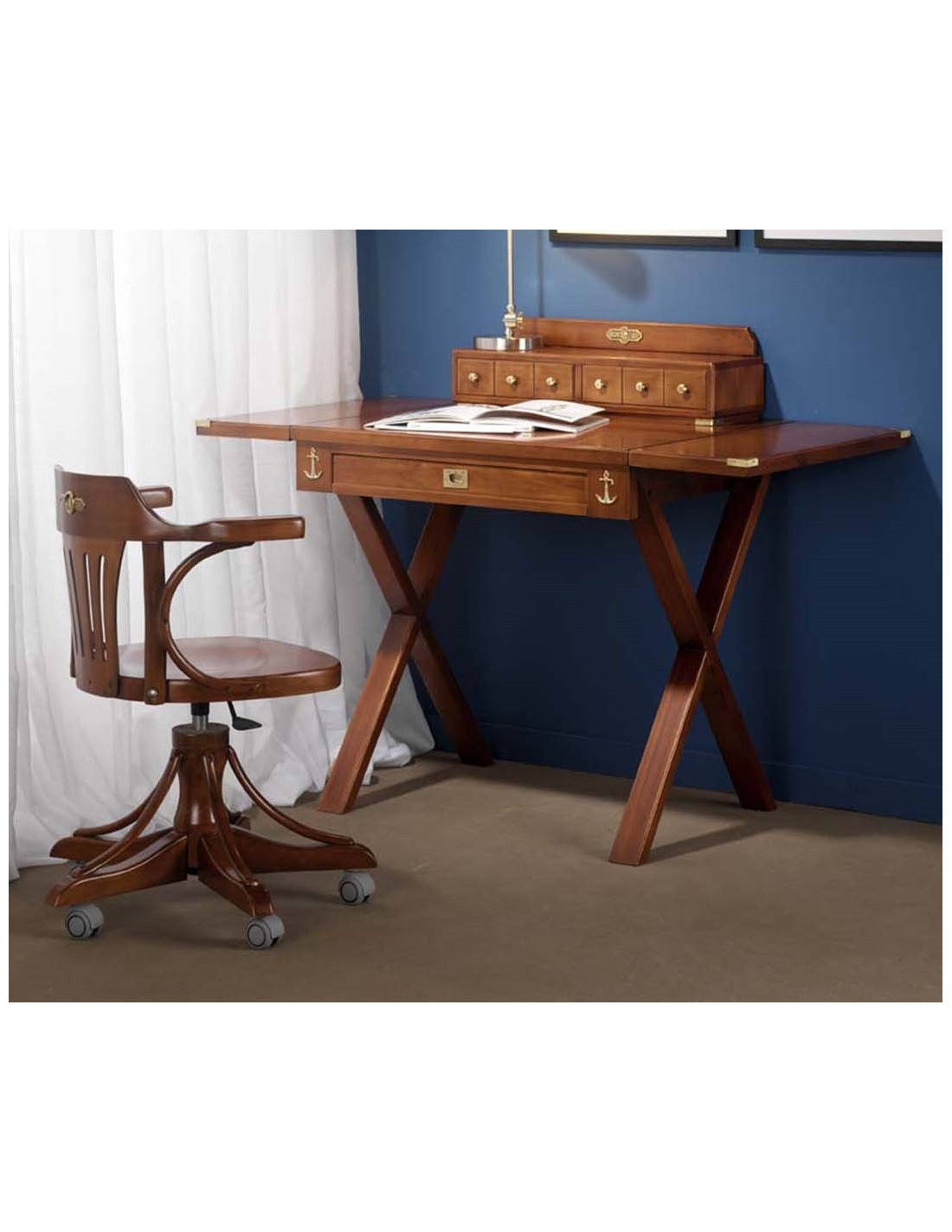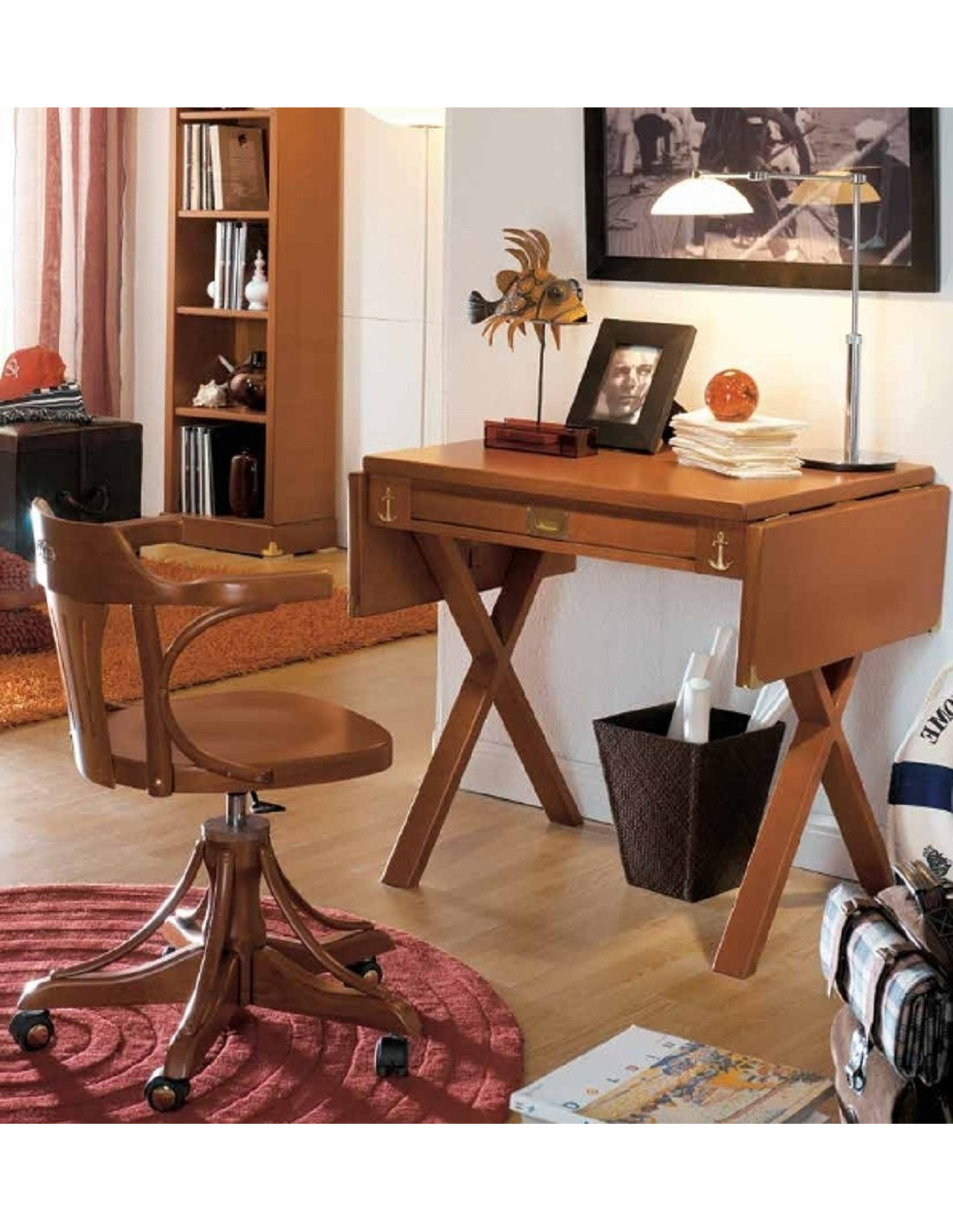 Esta mesa de escritorio Aspas tiene unos acabados pulimentados y barnizados de primera calidad, con la posibilidad de elegir entre blanco decapado, nogal claro y nogal naútico, con los detalles del mueble y herrajes de latón pulido.